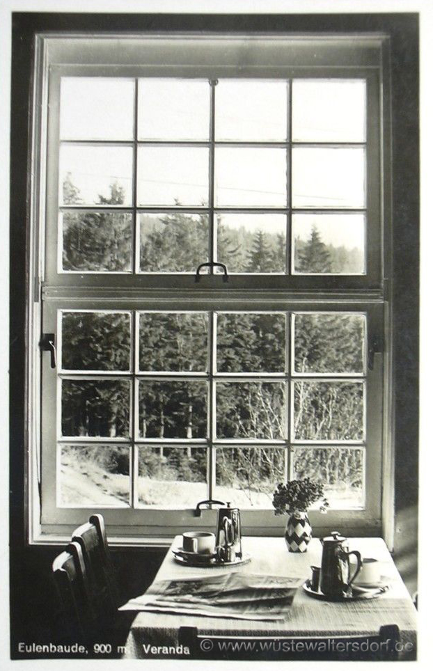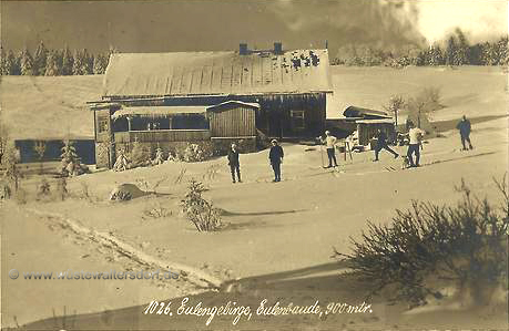 Recht nett sah die Baude aus, wenn sie zur Maienzeit oder Pfingsten mit frischen Birkensträuchern vor der Eingangstür geschmückt worden war und fröhliche junge Menschen in bunten Frühlingskleidern ein- und ausgingen. - Im Winter war die Eulenbaude Mittelpunkt des Skilebens. Da steckten große Wälder von "Brettel'n" im Schnee vor und seitwärts der Eingangstür und vom schneebedeckten Dach hingen lange, blanke Eiszapfen herab.