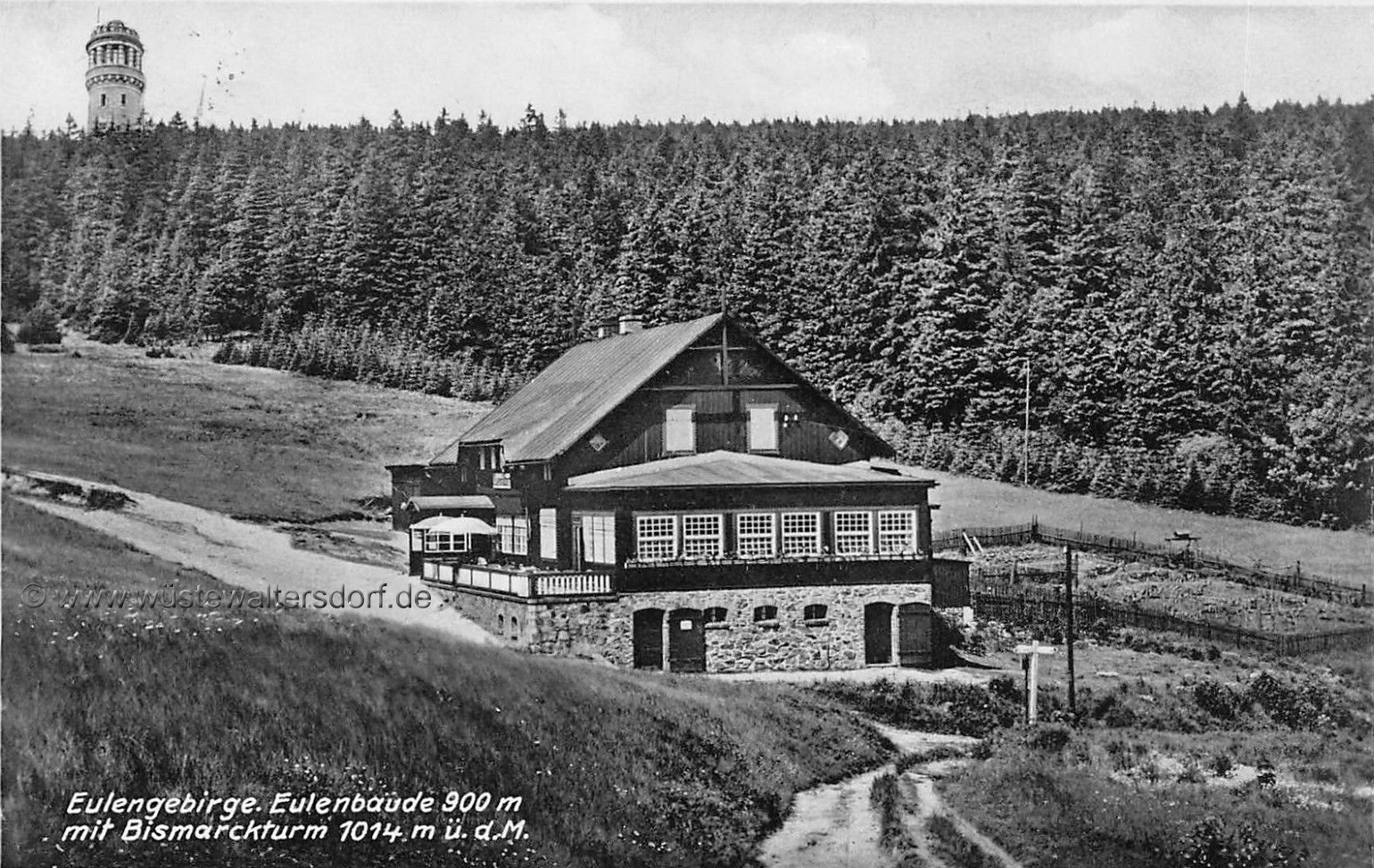 Dies war jedoch nicht immer so. In weit zurückliegenden Zeiten gab es an der Kreuzung Kaiserweg-Turmweg einen Kretscham, eine "Eulenschänke", die jedoch abbrannte. Damals mußten die noch wenigen Eulenkammbesucher dann auf der Eulenwiese den Kaffee selbst kochen, oder ganz darauf verzichten. Als 1882 der Eulengebirgsverband gegründet wurde, machte sich die fehlende Rastmöglichkeit stark bemerkbar. Da stiftete ein Freund der Berge, der Vorsitzende des Eulengebirgs-Vereins (EGV) Wüstewaltersdorf, Fabrikbesitzer Carl Wiesen, im Jahre 1895 in die höchste Kolonie - in der früheren Eulenburg -, später Euledörfel genannt, in 860 m Seehöhe, ein größeres Grundstück zur Errichtung einer Schutzhütte. Diese wurde 1896/97 erbaut.. ....(1)<<