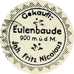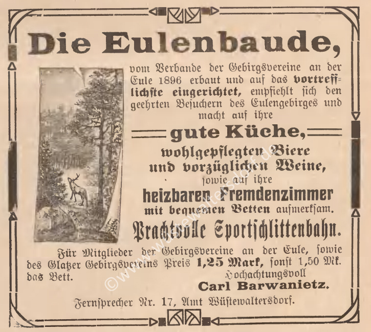 "Eulenbaude Eigentum des Verbandes der Gebirsvereine an der Eule, Pächter Fritz Nicolaus, Fernsprecher Wüstewaltersdorf 17, 5 Zimmer, 16 Betten, Zentralheizung, Pensionspreis 5,50 RM."
