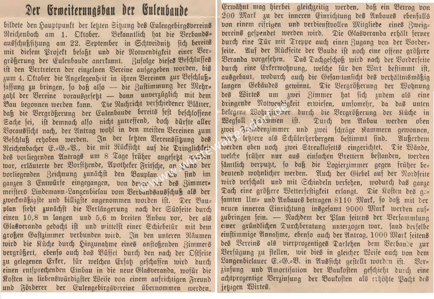 März 1920: aufgrund der enormen Preissteigerung beschloss die Verbandsversammlung der Eulengebirgs-Vereine den Bau der neuen Nebengebäude nicht durchzuführen.