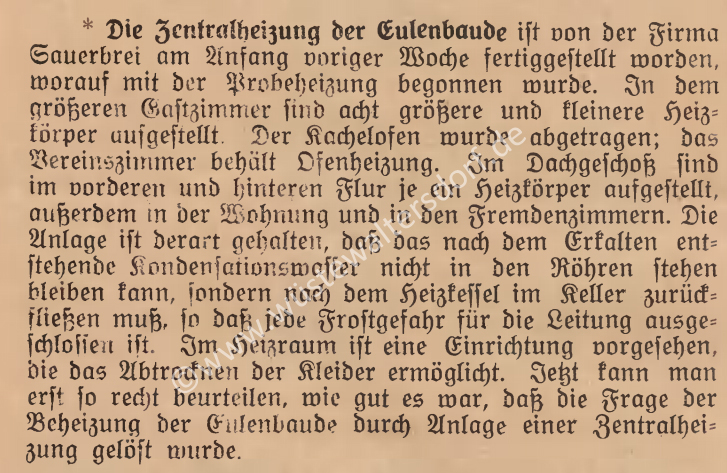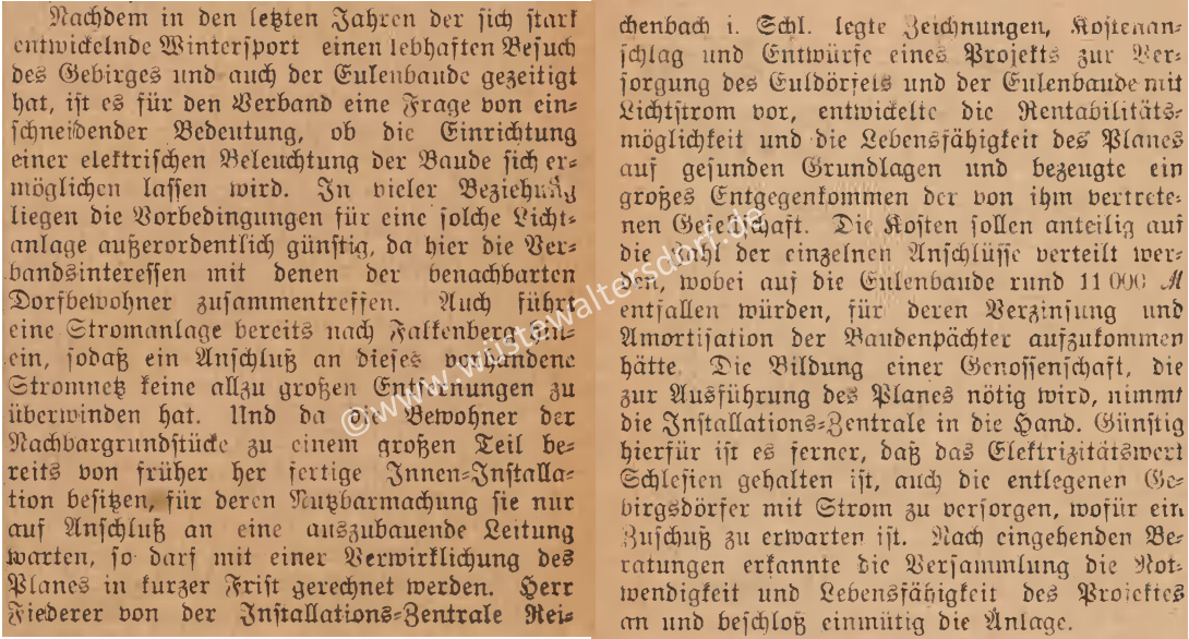 24.9.1921: wurde beim Verbandstag des EGV entschieden, elektrisches Lichts in die Baude zu legen. Dafür nimmt der EGV eine Hypothek von 11.000 Mark auf.