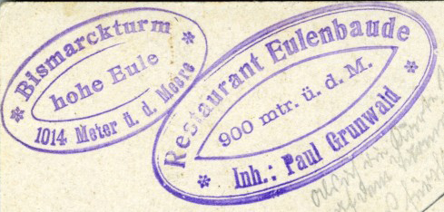 5.6.1915: Eulenbaude und der Bismarckturm, Eigentum des Eulengebirgs-Vereins, haben einen Wert von 30.000 Mark, sie sind für 1.500 Mark Jahresmiete verpachtet. Die Eulenbaude hat noch 15.855 Mark Gesamtschulden.