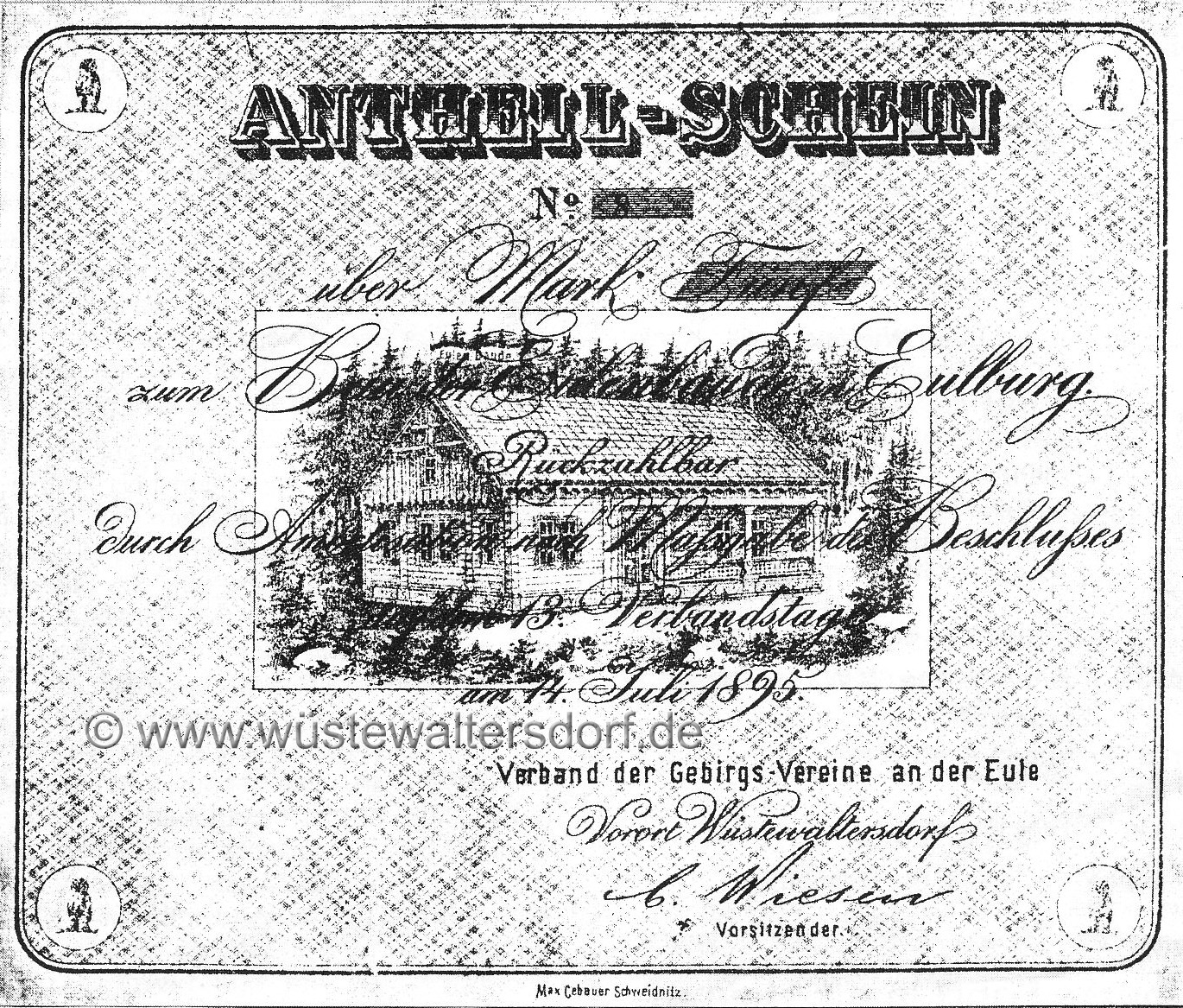 Zur Finanzierung der Baude wurden Anteilscheine vom Verband der Gebirgsvereine an der Eule herausgegeben. Links die Kopie eines der Scheine von 1895: "Antheil-Schein Nr. 8 über Mark Fünf zum Bau der Eulenbaude in Eulburg. Rückzahlbar durch nach Maßgabe des Beschlußes auf dem 13. Verbandstag am 14. Juli 1895" Verband der Gebirgsvereine an der Eule Vorort Wüstewaltersdorfs C. Wiesen Vorsitzender" |