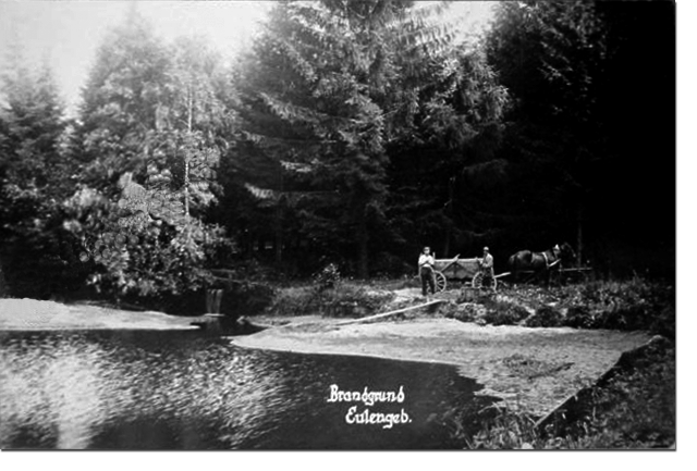 Nach Süden hin ging der Blick auf die Berge von Wartha und das Reichensteiner Gebirge. Das sumpfige Gelände des „Brandes" bei Lampersdorf war bis ins Mittelalter noch bewaldet, da es für Ackerland nicht geeignet war. Nach und nach aber wurde es von Holzfäller, Köhlern und Aschenbrennern entwaldet. Das Gehölz wurde durch Verbrennen, durch „Brand", in Holzkohle und Holzasche (Pottasche) verwandelt. Man brauchte sie in den Glashütten und beim Bleichen der Leinwand, denn die drei oben genannten ehemals rein bäuerlichen Waldhufendörfer waren inzwischen zu Weberdörfern geworden. An diese Zeit der Entwaldung erinnern im Neuroder Gebiet die ehemaligen Glashütten in Hausdorf, Volpersdorf und Köpprich und die Flurnamen Ascherkoppe (856 m hoher Berg im Eulengebirge), Ascherkamm am Bielauer Plänel und der Glaser- und Köhlergrund bei den Brandhäusern. Auf dem ehemals bewaldeten „Brande" liegen jetzt die feuchten „Brand- und Pfingstwiesen" vor den Brandhäusern.