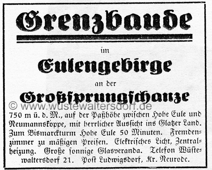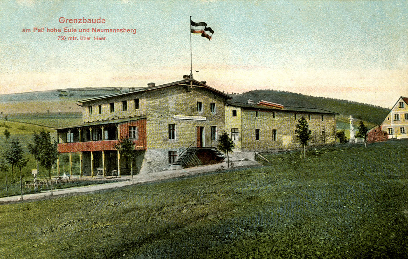 Die Grenzbaude lag in Schlesisch-Falkenberg direkt an der Kreisgrenze zum Glatzer Land auf 750m. Sie wurde am 1. Juni 1907 eröffnet.