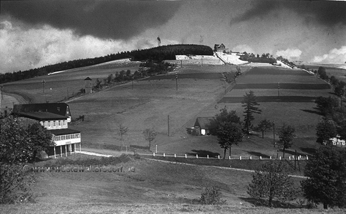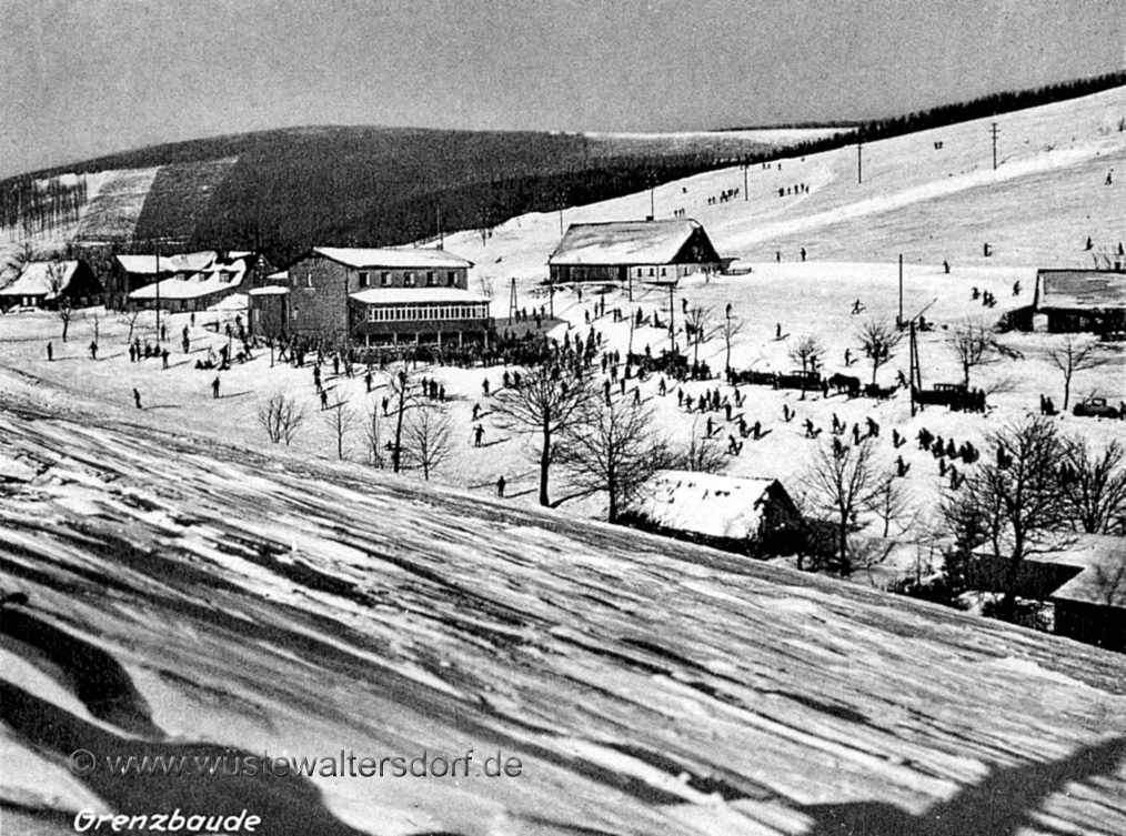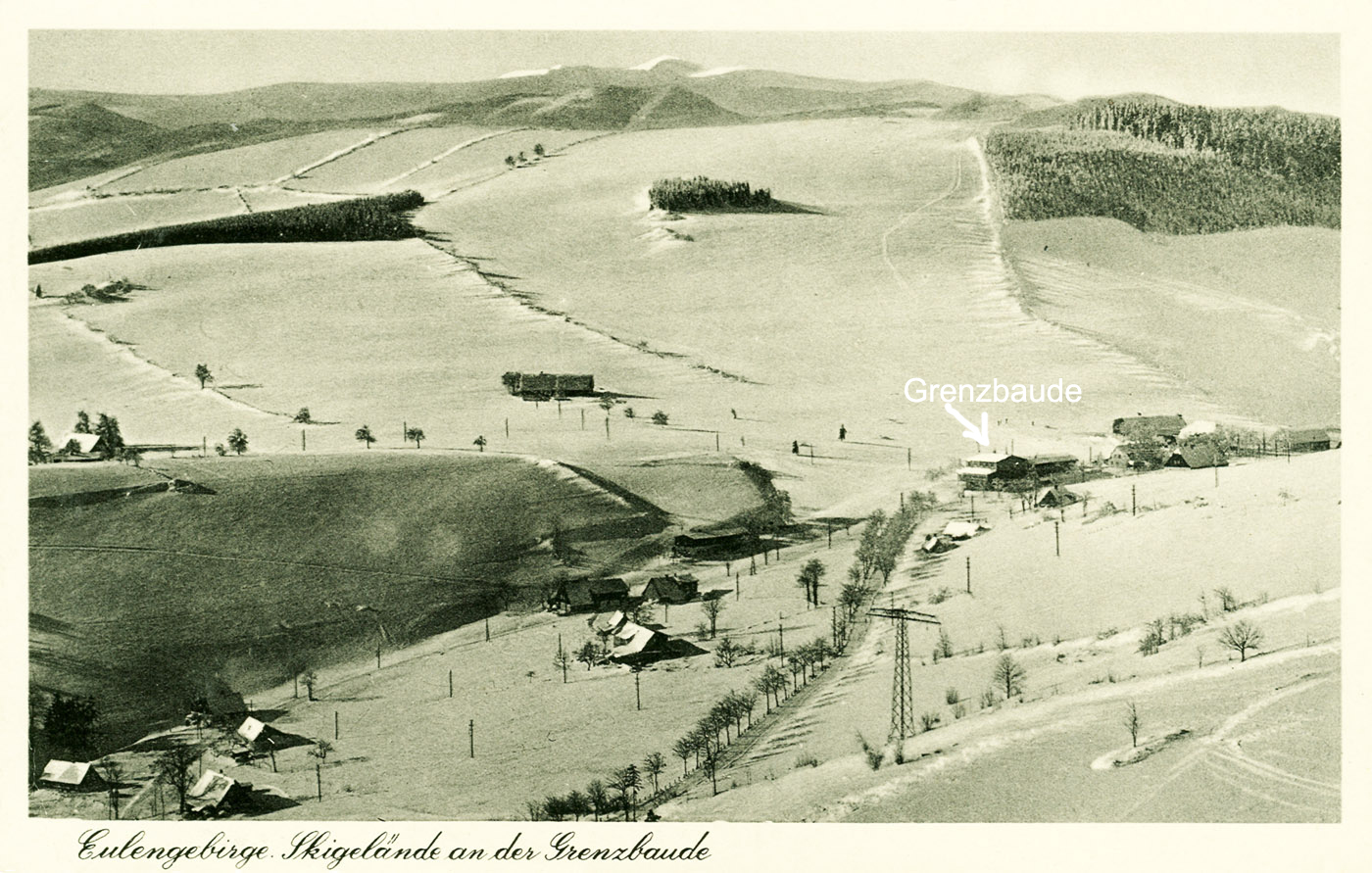 | Grenzbaude im Winter mit Skigelände, Blick Richtung Waldenburger Bergland | |