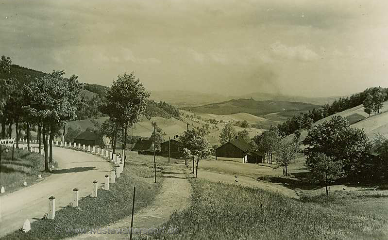 Zwei Sichten auf die Baude: oben von Glätzisch Falkenberg auf die Baude (im Bild oben Mitte), rechts Blick von der Veranda auf die Häuser die im Bild oben mittig zu sehen sind.