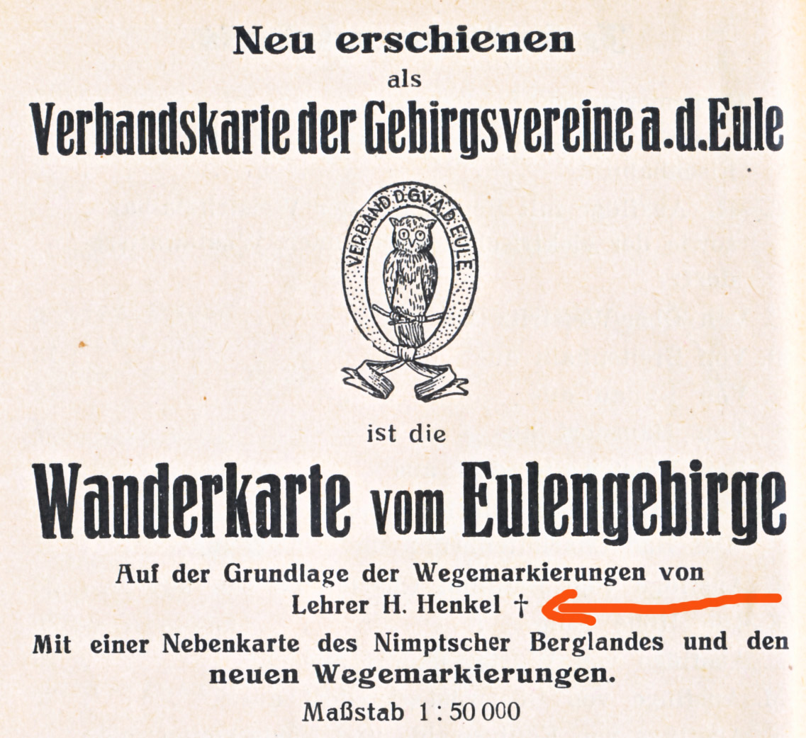 Anzeige für die Wanderkarte erschienen in Briegers "Kreuz und quer durch das Eulengebirge und die benachbarten Berge" von 1926.