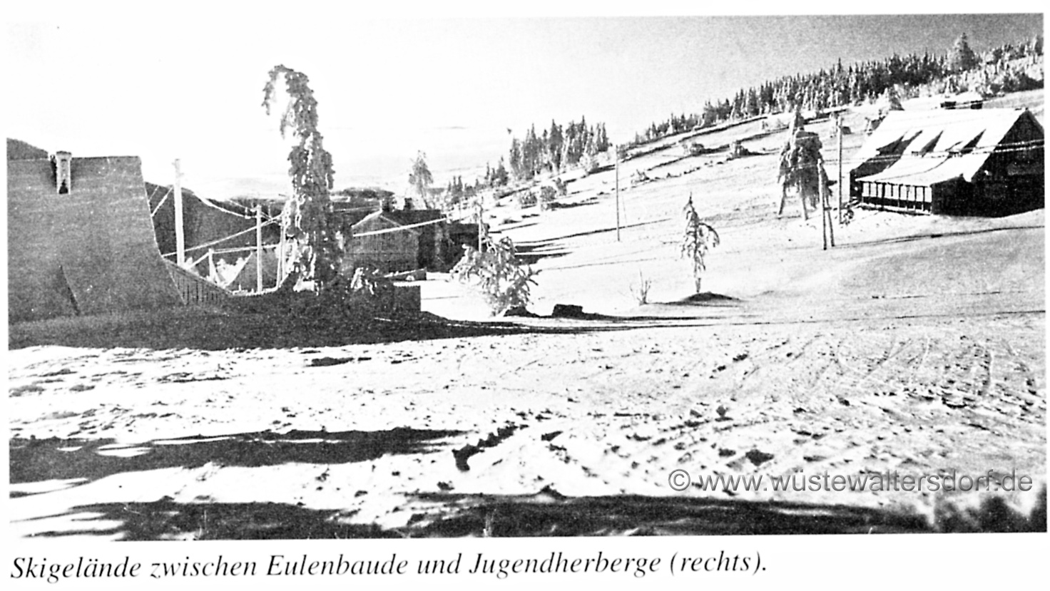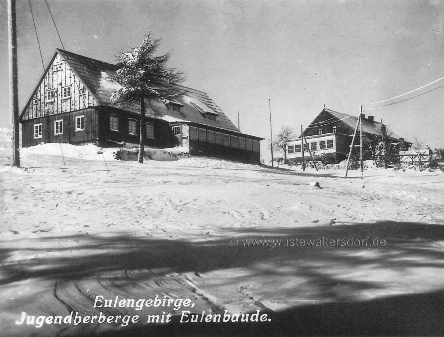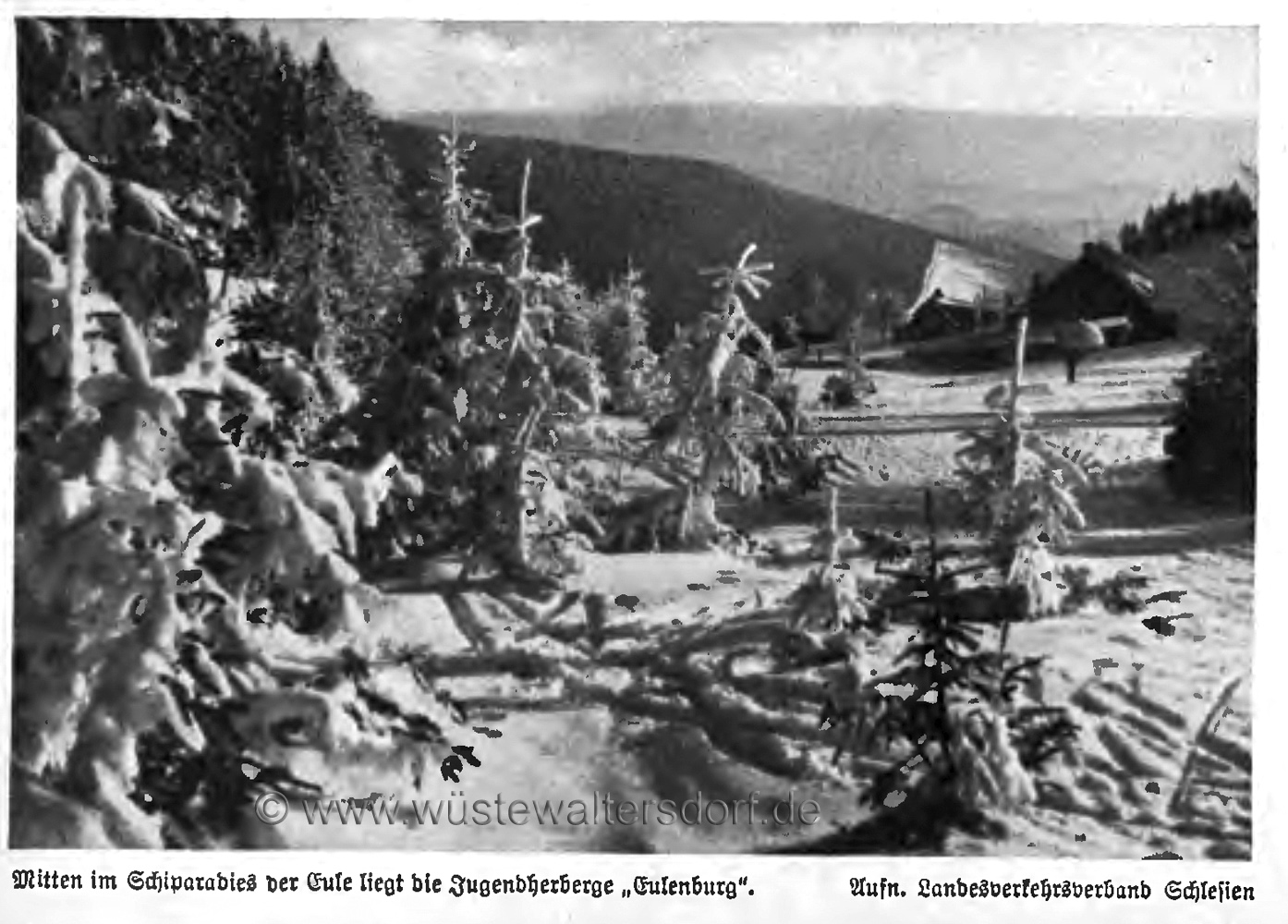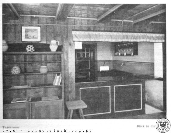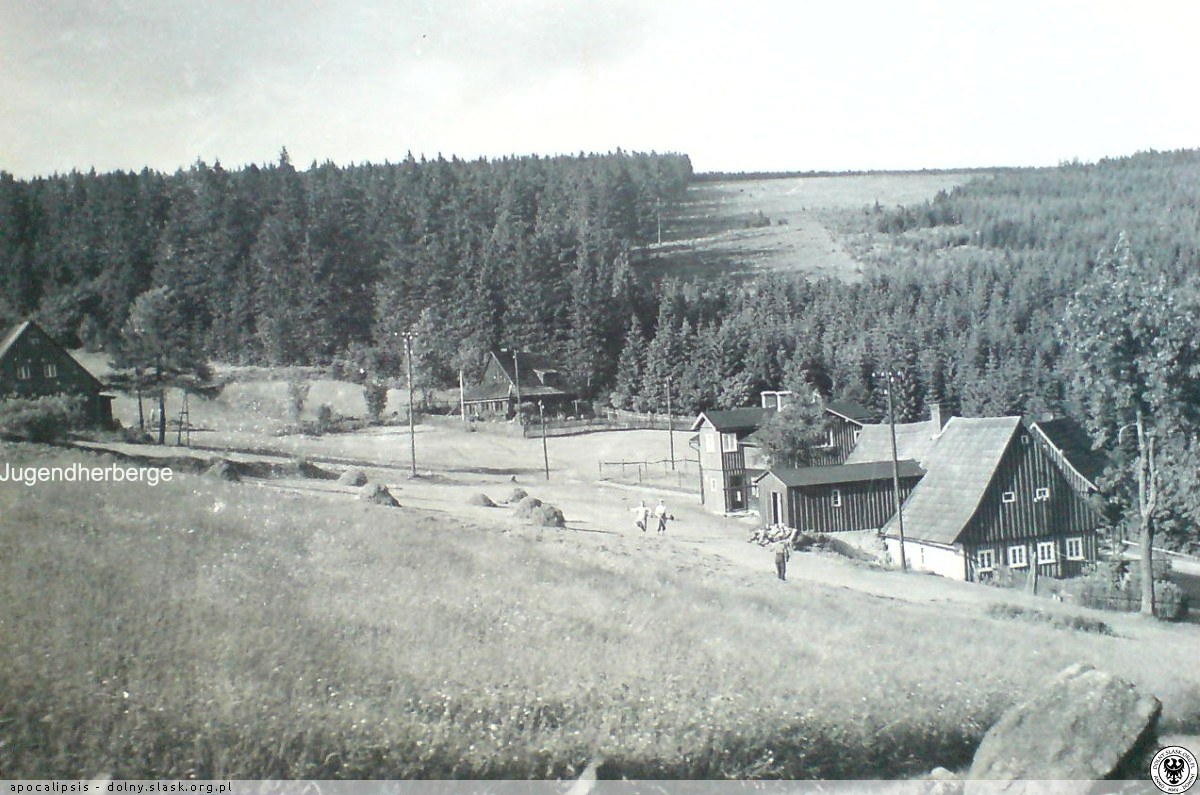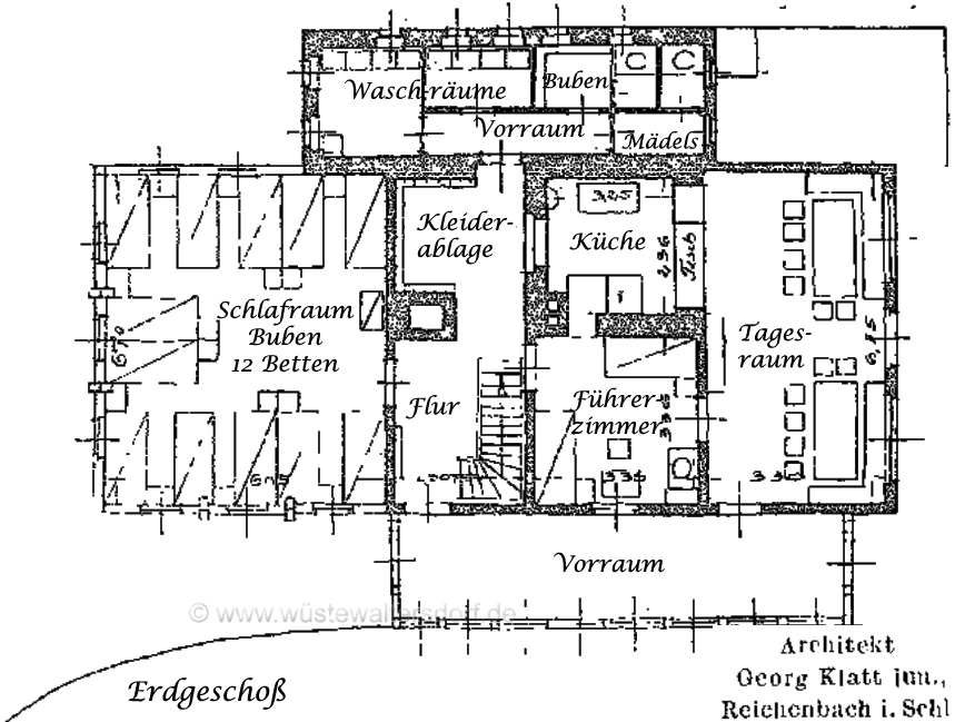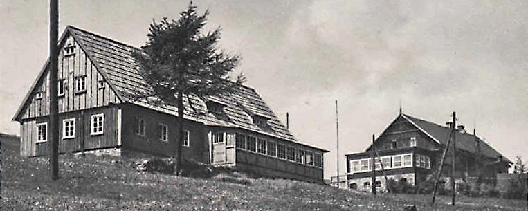 >>Im Sommer 1927 wurde im Eulengebirge die Jugendherberge „Hohe Eule" geweiht und ihrer Bestimmung übergeben, die nach den Entwürfen des Architekten Klatt jun. aus Reichenbach durch Umbau des alten Tannehauses entstanden ist. Durch einen dem Haus vorgelagerten mit Glasfenstern abgeschlossenen Vorraum gelangt man ins Erdgeschoß in den Treppenflur der Jugendherberge und betritt von hier aus zur Linken einen Schlafraum mit 12 Betten und zur Rechten ein Führerzimmer mit zwei Betten. Durch die Kleiderablage, die den hinteren Teil des Flures einnimmt, gelangt man in die Herbergsküche. Sie ist mit einem Kachelherd, der eine große Plattenfläche und ein Warmwasserschiff enthält, ferner mit einem Doppelspültisch, Wasserzu- und -Ableitung ausgestattet und durch einen Ausgabetisch, der gleichzeitig als Küchenschrank benutzt werden kann, mit dem Tagesraum·, den man auch vom Führerzimmer und vom Vorraum aus direkt erreichen kann, verbunden. Dem Tagesraum vorgelagert ist ein eingeebneter offener Vorplatz.