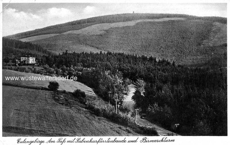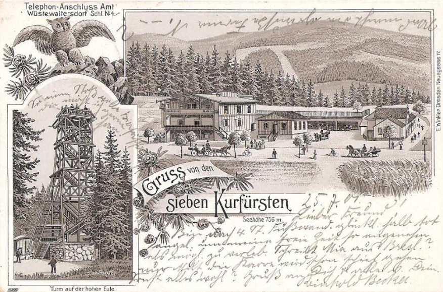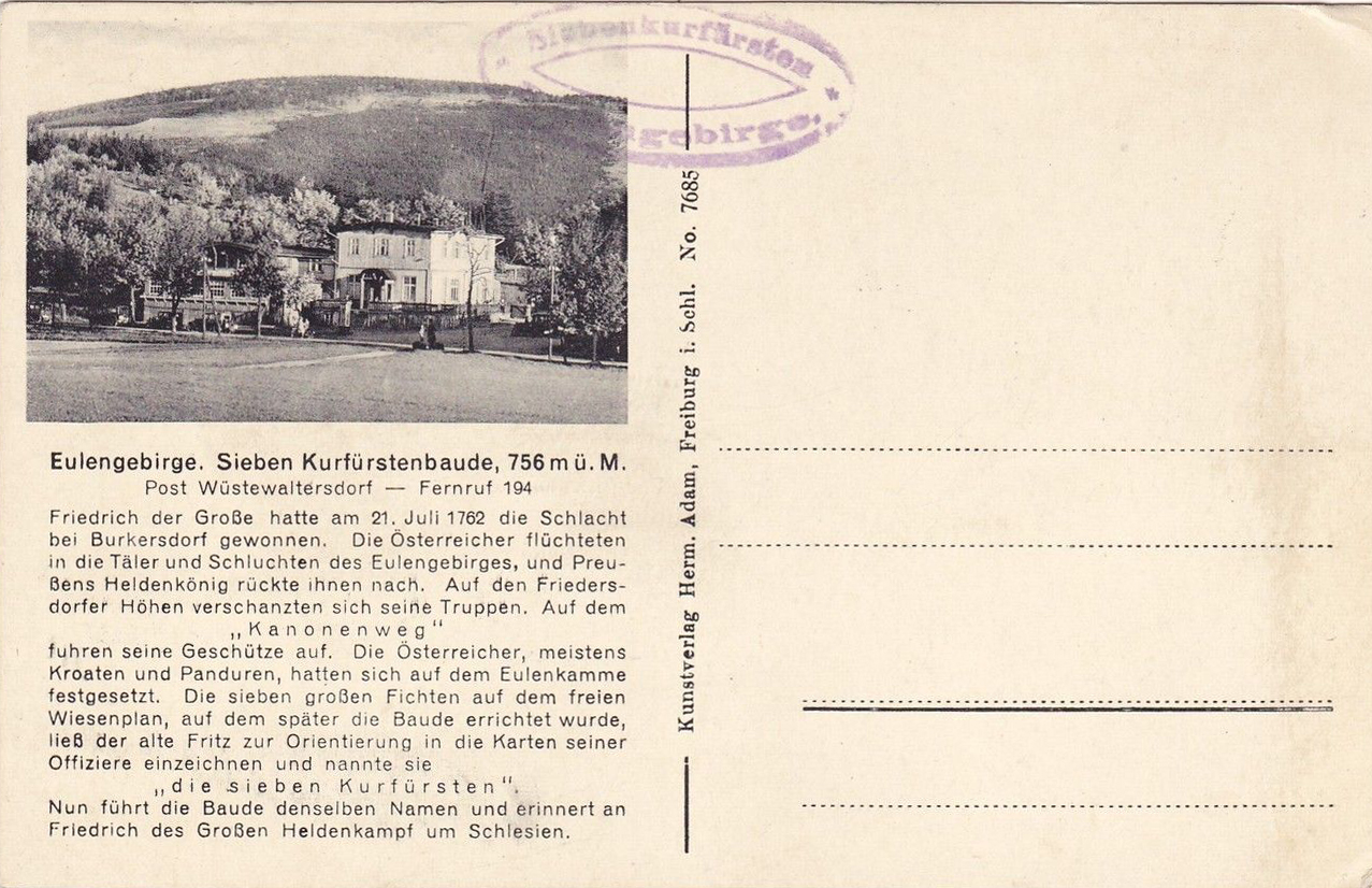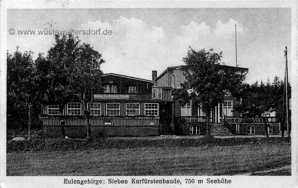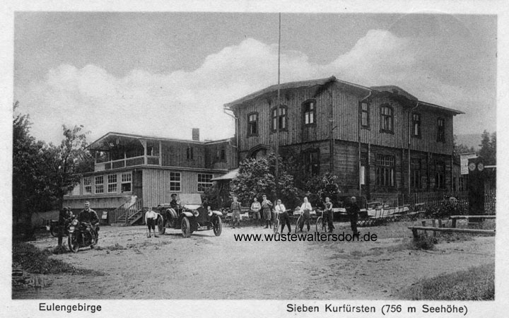 Die Baude zu den Sieben Kurfürsten ist an der Paßstrasse von Wüstewaltersdorf nach Reichenbach am Scheitelpunkt auf 756 m gelegen.