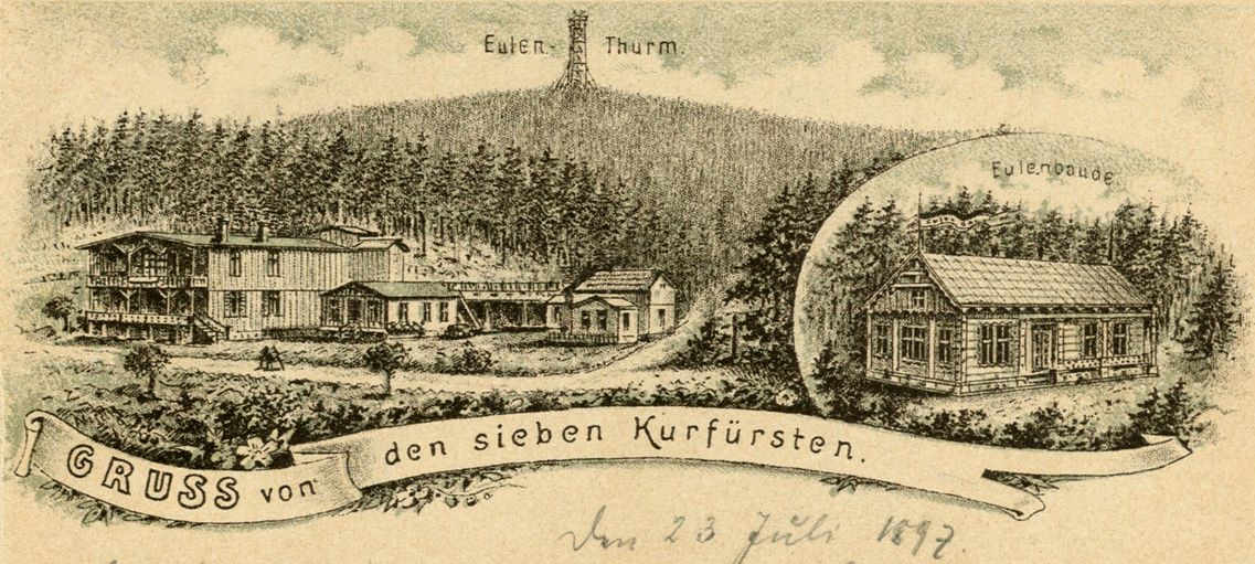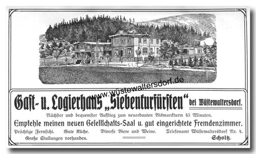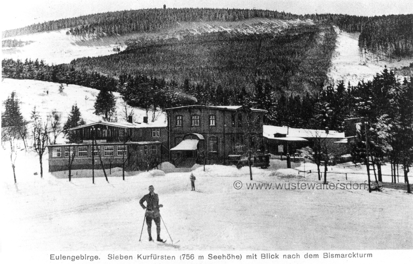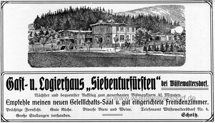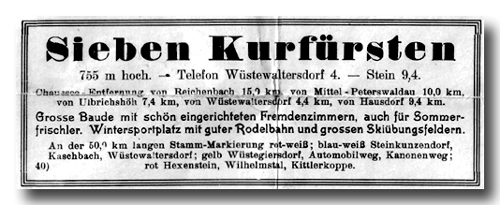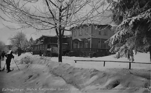 Das "Gasthaus zu den Sieben-Kurfürsten" war dann jahrzehntelang im Besitz der "Muttel Scholtzen" (Ida Scholtz). Im Sommer 1924 verstarb sie und ein neuer Wirt, Richard Niedermeyer, übernahm den Betrieb. Die Räume wuchsen, Anbauten und Veranden kamen hinzu. Saal und Baudenstuben wurden von dem Jagd- und Landschaftsmaler Mailick ausgeschmückt. - Die Bedeutung als Kohleumschlagplatz war nun Vergangenheit, sie entwickelte sich zu einem Ausflugsziel und Einkehr für Wanderer und Skiläufer.