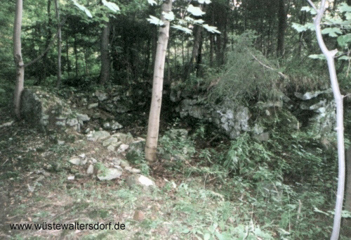 | Sommer 2001, hier stand die Baude, im Hintergrund ist heute ein Rastplatz für Wanderer | Sommer 2001, Reste der Grundmauern (Photo W. Leistritz) |