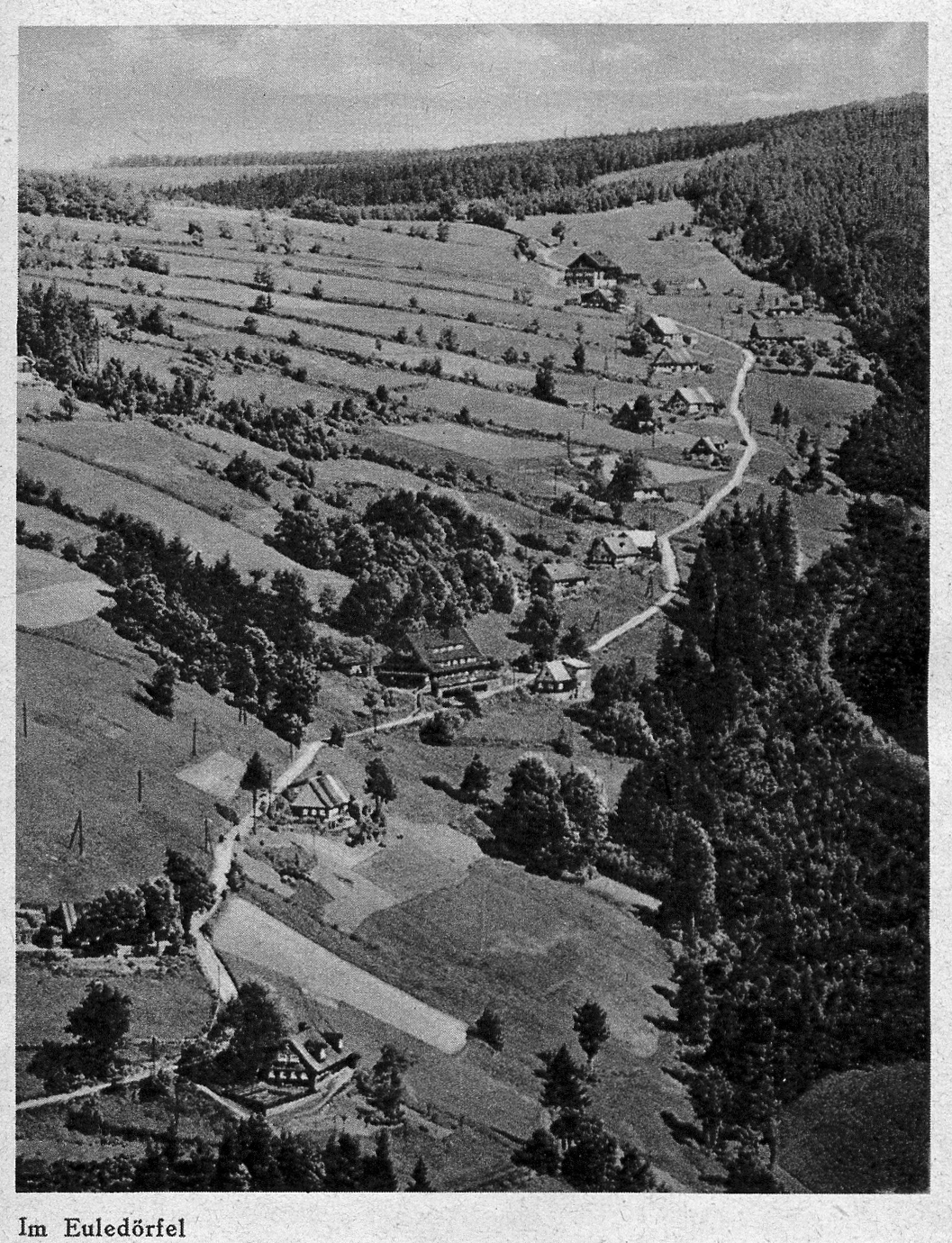 | malerische Lage der Baude im Euledörfel, Baude in der Mitte des Bildes, Foto von 1933 | |