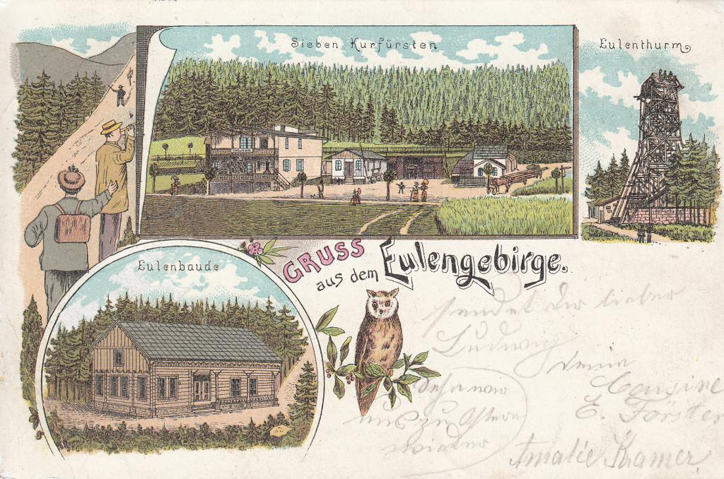 Zimmermeister Schnabel (wohl aus Wüstewaltersdorf) entwarf den Plan für ein Schutzhaus mit Logiermöglichkeit, das in der Nähe des Turms auf einem 11 Morgen großen, von einem Freunde des Gebirgsvereins (Fabrikbesitzer Carl Wiesen aus Wüstewaltersdorf, siehe Text über die Eulenbaude, A.d.R.) geschenkten Geländestück vom Planverfasser Schnabel erbaut wurde und 1896 fast fertig war. Kosten ca. 7000 Mark. Es ist die heutige Eulenbaude.