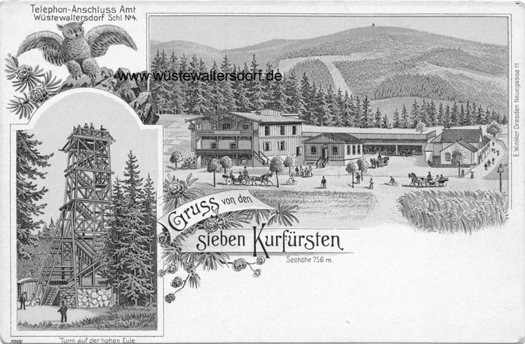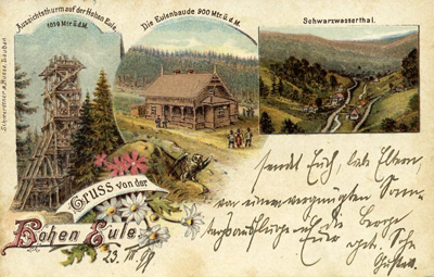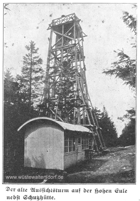 Der Grundbesitzer, Graf Magnis auf Eckersdorf, erteilte die Bauerlaubnis, einen Aussichtsturm auf der Hohen Eule zu errichten. Am 14.7.1885 Auswahl des Bauplatzes. Der Wüstewaltersdorfer Gebirgsverein beteiligte sich an der Finanzierung.