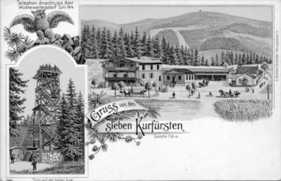 Auch der alte Aussichtsturm war schon beliebtes Motiv auf den damals gerade aufkommenden Ansichtskarten. Beide Aufnahmen 1899, Quelle:dolny-slask.org.pl