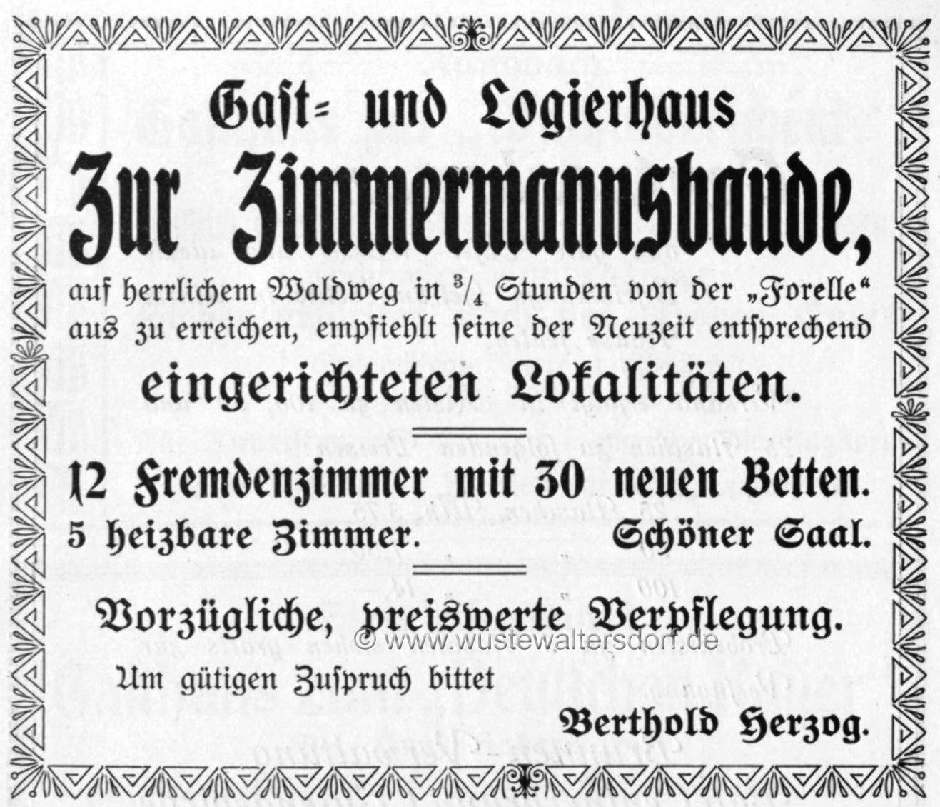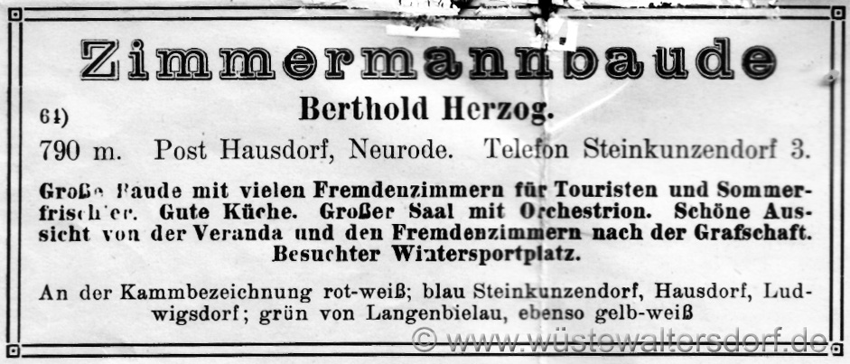 1932 finden wir in (2) folgende Angaben: "Besitzer Berthold Herzog, Fernsprecher im Hause, Veranda, Dampfheizung, 10 Zimmer, 30 Betten, Zimmer heizbar, Zimmer mit Pension 5,00 RM, ohne Pension Bett 2,00 RM, 20 Lager 0,30 bis 0,50 RM, Wald, Wiese."