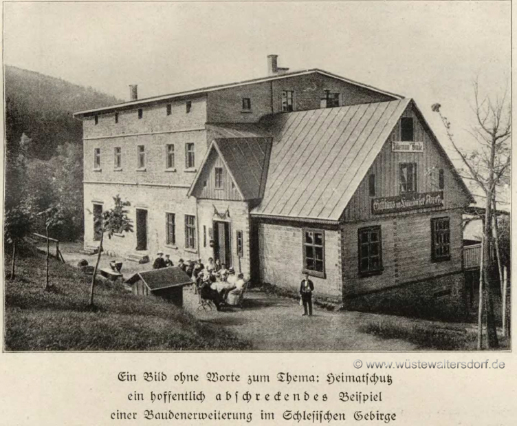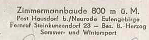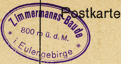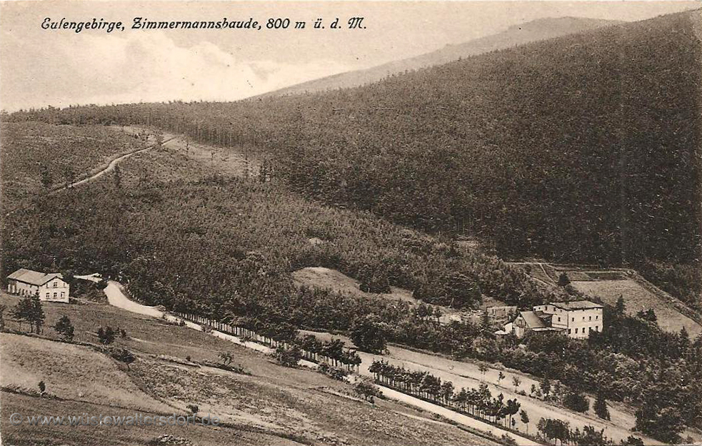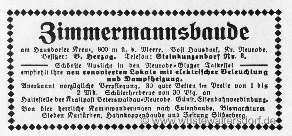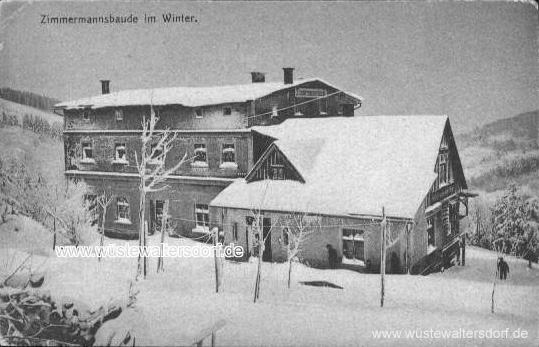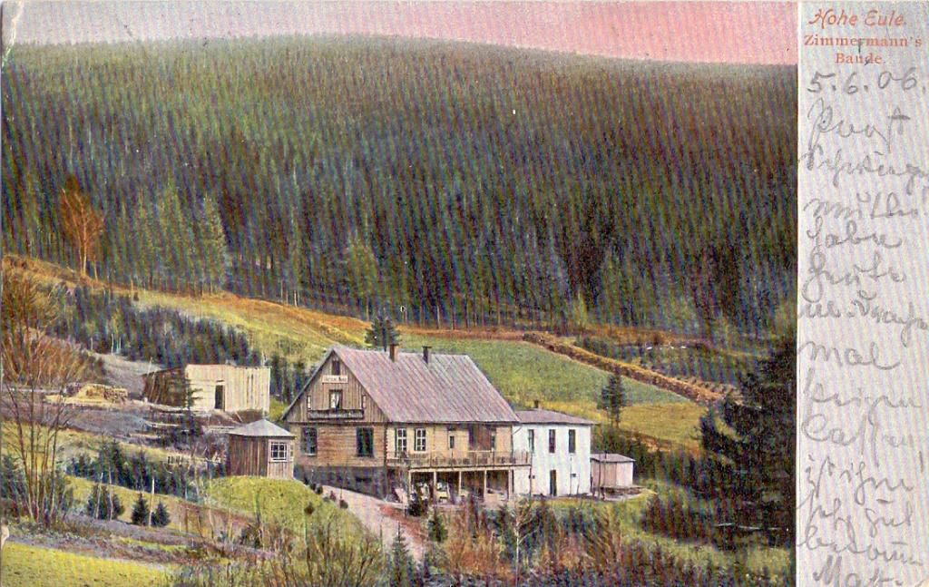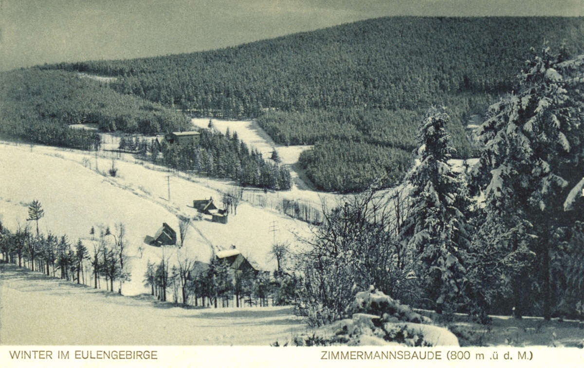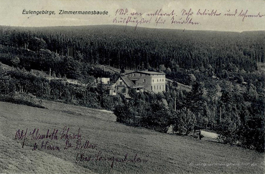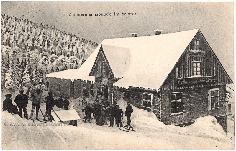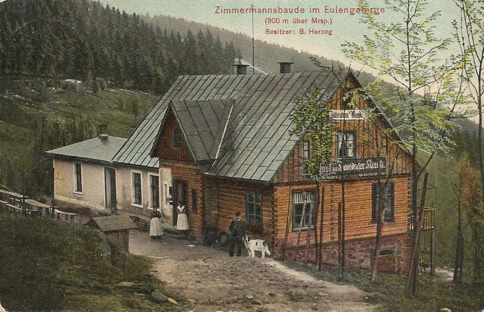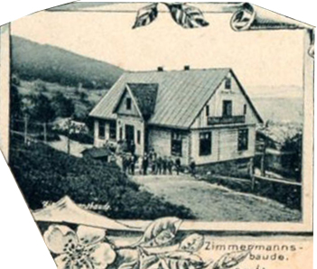Das war die Lage, die Fabrikant Zimmermann antraf. Seine Dienstagsbesprechnungen hatten sich schon zu kleinen Gesellschaften ausgewachsen, zumal sein Bekanntenkreis diesseits und jenseits des Gebirges grösser wurde. Es reifte in ihm allmählich der Plan, sie in eine eigene Baude zu verlegen. Am höchsten Punkte, der über den Eulengebirgskamme führenden Paßstraße, in der Nähe der Hausdorfer Kreuzes, sollte sie entstehen: diese aussichtsreiche Gegend war ihm vertraut und lieb geworden. ..... (1)<< (Die ganze Geschichte kann hier nachgelesen werden).