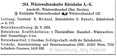 Im letzten vorliegenden Eintrag der Wüstewaltersdorfer Kleinbahn Aktiengesellschaft im „Handbuch der Deutschen Aktien-Gesellschaften 1944“ werden nur noch „Aufwendungen für den Bahnbetrieb“ und „Einnahmen aus dem Bahnbetrieb“ erwähnt, Angaben zum Kraftverkehrsbetrieb finden sich keine mehr. - Vermutlich wurde nach 1940 der Busbetrieb aufgrund von Benzin-Knappheit eingestellt.