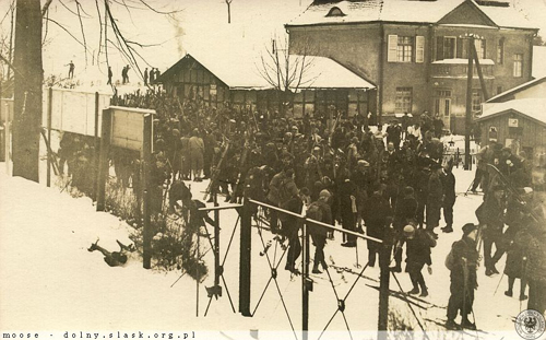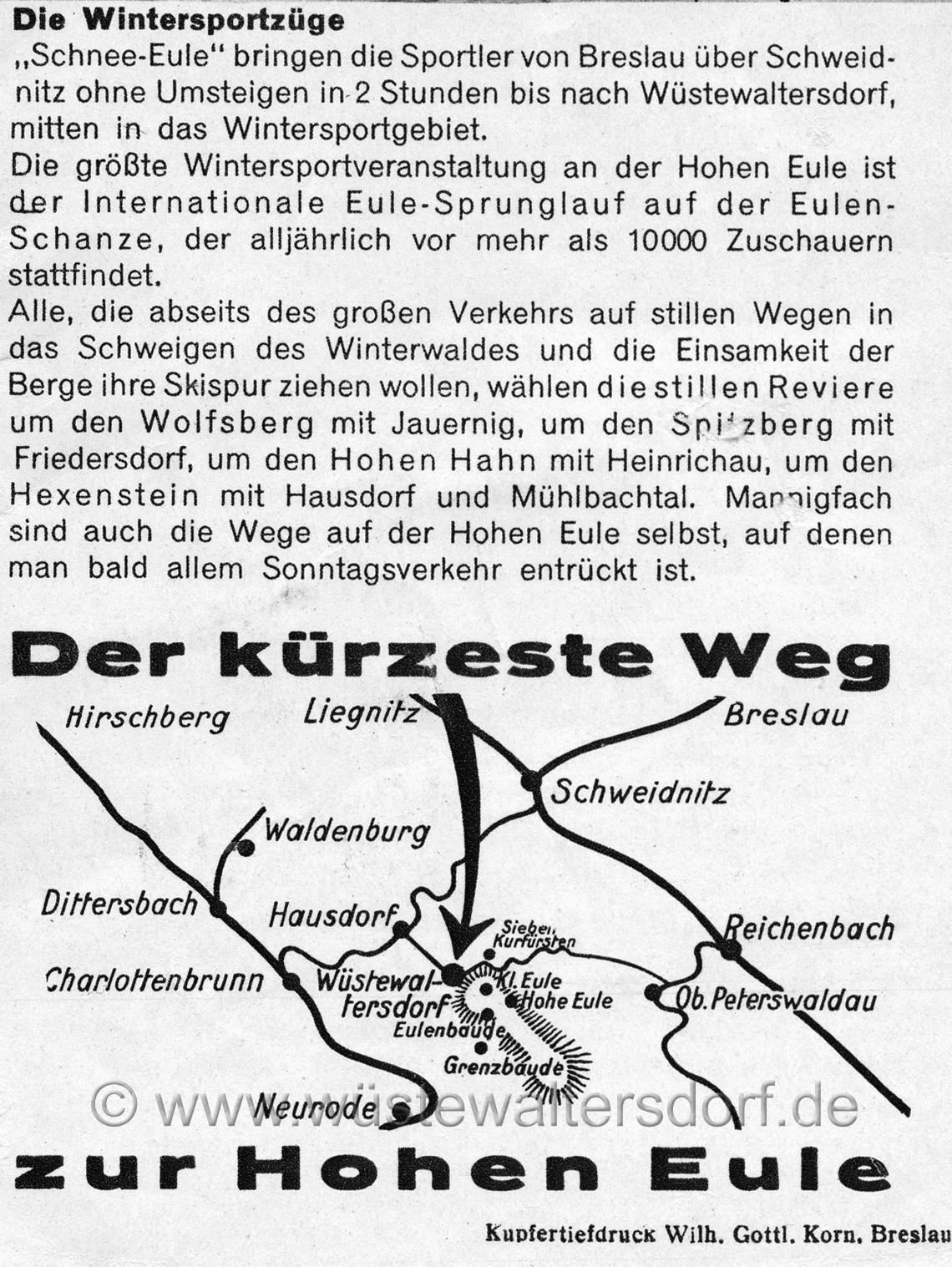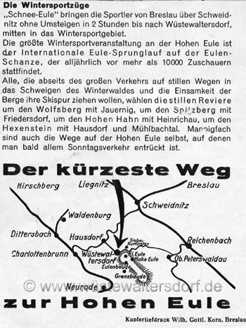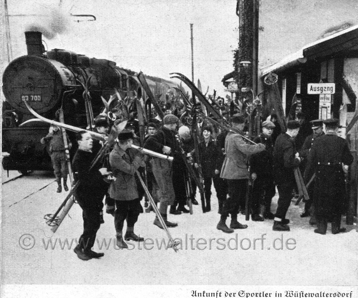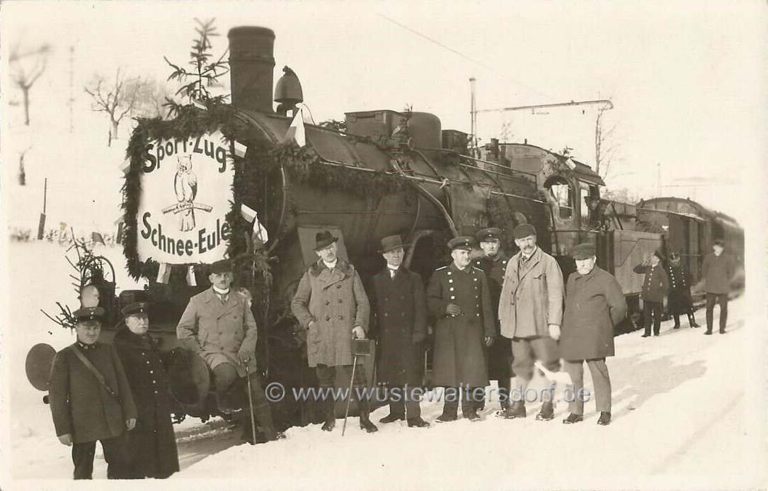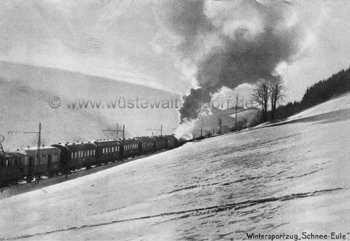 Neben dem Wintersport sprägte ab ca. 1930 ein Gross-Ereignis die Region, der Eulesprunglauf, der jährlich im Januar auf der Euleschanze bei Glätzisch-Falkenberg stattfand. Bis zu 10.000 Besucher wohnten der Veranstaltung bei. Zum Transport wurden Sonderzüge zum Bahnhof Wüstewaltersdorf eingesetzt. Die Züge wurden besonders geschmückt und an den Seiten mit Wintersportmotiven bemalt. - Die Bedeutung unterstrich auch, dass sich die Dorfhonoratioren und der Landrat mit dem Zug ablichten liessen. |