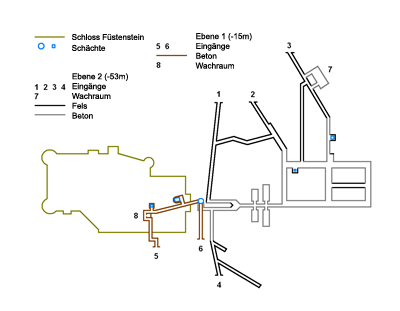 Weiterhin wurden unter dem Schloss durch die Organisation Todt große Stollensysteme in zwei verschiedenen Ebenen, 15 und 50 Meter unterhalb des Schlosshofes, aufgefahren. Von diesem Schlosshof grub man einen gewaltigen Fahrstuhlschacht mit einem Durchmesser von 6 Metern bis in 50 Meter Tiefe. Das oben erwähnte, für Hitler vorgesehene Gobelinzimmer, wurde ebenfalls mittels eines Fahrstuhlschachtes an das untertägige Stollensystem angebunden.