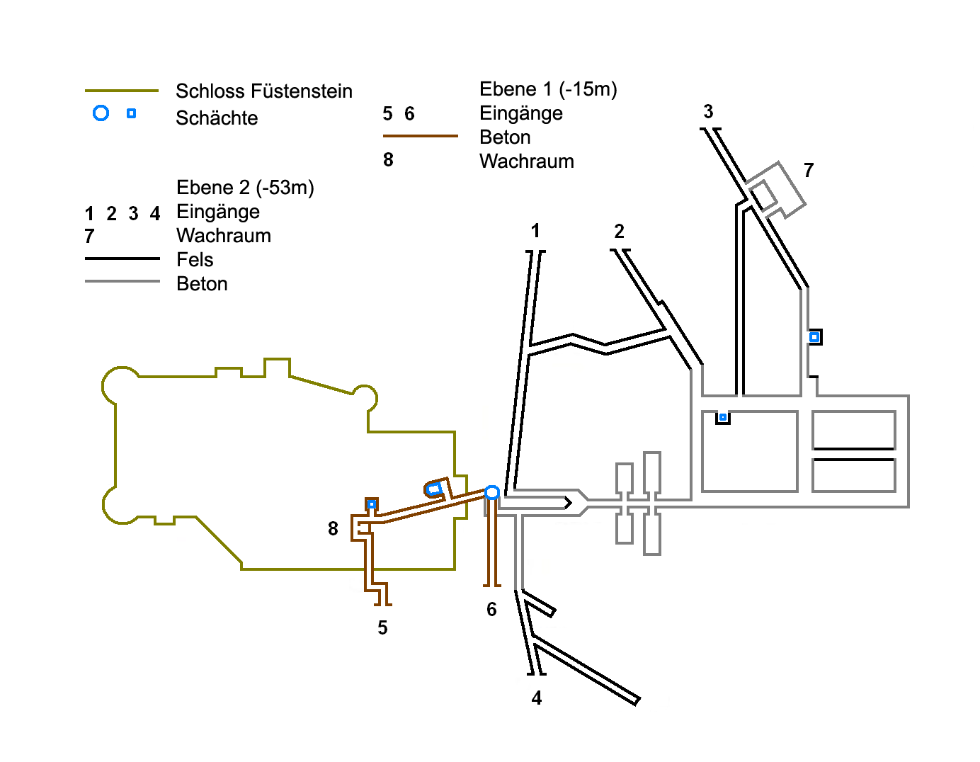 Das untere Stollensystem befindet sich dagegen, wie schon oben erwähnt, in 50 Metern Tiefe. Es verfügte über drei Eingänge auf der nördlichen Seite des Schlossberges, sowie einen Eingang auf der südlichen Seite. (Bericht Team-Delta)