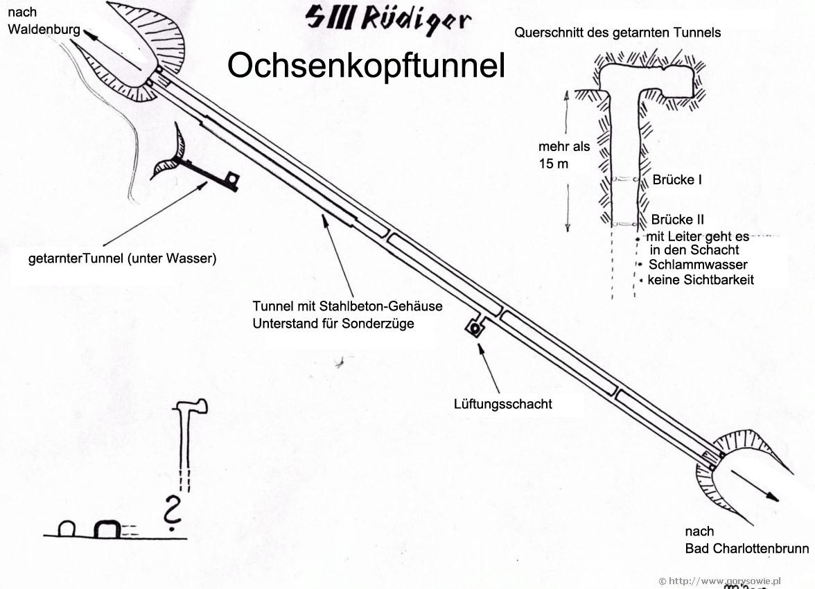 Bei dem genannten Netz mit 20 Fernleitungen handelte es sich um die Nachrichtenzentrale „Rüdiger“, die unter dem Schloss Fürstenstein in dafür, in den Fels gesprengten Stollen installiert worden war und weitgehend fertig-gestellt werden konnte. Da alle anderen Anlagen aber nicht existierten und auch „Rüdiger“ noch nicht in das Fernkabelnetz eingebunden war, blieb diese einzige Nachrichtenzentrale bedeutungslos. Die o. g. Fernleitungen waren offenbar im Rahmen der sogenannten „Nachrichten-Lehr- und Versuchsübung I“ (Deckname) von Angehörigen des Führungs-Nachrichtenregiments (Fü.NaRgt.) 601 durch den Bau von Drehkreuzlinien bereitgestellt worden. Im Rahmen dieser „übung“ waren Soldaten des Fü.NaRgt. 601 auch auf der Baustelle des Verstärkeramtes Schweidnitz II eingesetzt.
