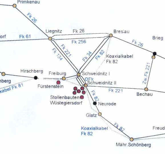 Zur Anbindung der neuen Hauptquartiere an das Fernkabelnetz sollten drei, über Freiburg führende Fernkabel nach Liegnitz, Kattowitz und Niesky ausgelegt werden, die ihren gemeinsamen Ausgangspunkt vorerst im bestehenden Verstärkeramt Schweidnitz hatten. Später sollte an seine Stelle ein unterirdisches, verbunkertes Verstärkeramt Schweidnitz II treten. Da die Fern-meldebauarbeiten unverzüglich begonnen wurden, waren am 31. März 1944 bereits 63 von insgesamt 431 Kilometern der drei Fernkabel ausgelegt. Weitere von der Deutschen Reichsspost (DRP) vorgeschlagene Kabel - die die Anbindung wesentlich verbessert hätten - wurden wegen unzureichender Bereitstellung von Rohstoffen, insbesondere Kupfer, abgelehnt.