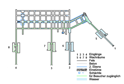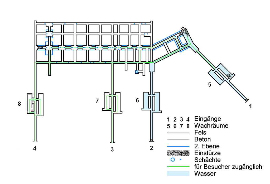 Er besteht aus 4 Stollen mit einer Länge von 180 und 240 Metern. Diese sind verbunden mit einem System von Gängen und Hallen, welche rechtwinklig zu den Stollen verlaufen. Aus einem der Gänge zwischen Stollen 2 und 3 (nördlicher Eingang) führt ein Transportschacht zur Oberfläche. Dieser Transportschacht ist 40 m tief und hat einen Durchmesser von 4 Metern. Am Ende der Verlängerung des Stollens Nummer 1 befindet sich eine große Halle 50 m lang, 8 m breit und 10 m hoch. In etlichen Publikationen wurde die Meinung vertreten, die Halle sei an ihrem heutigen Ende mit einem Einsturz verschlossen worden und sehr wahrscheinlich befänden sich dahinter weitere (fertige) Teile des Systems. Untersuchungen vor Ort stützen diese These nicht.