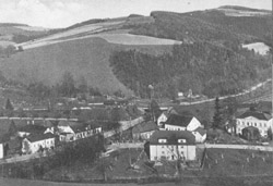 Karl Malysiks Gasthaus zum Gebirgstal, Dorfpartie mit Kriegerdenkmal, Schule, Kriegerdenkmal