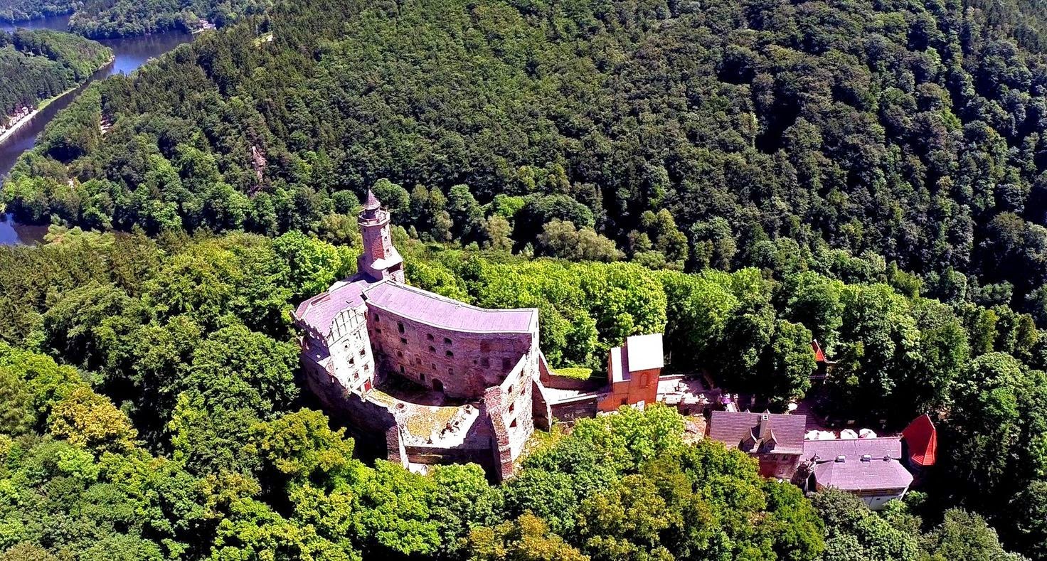 Luftaufnahme der Kynsburg Sommer 2015, sie hat ein Dach bekommen |