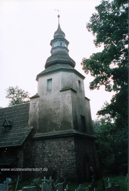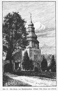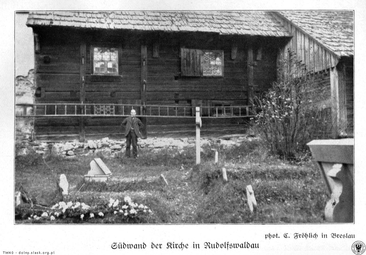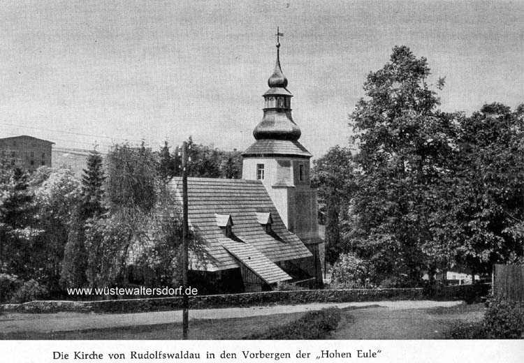 >>Es handelte sich dabei um eine Dorfkirche, die uns in ihrer ursprünglichen Form, bis auf spätere Ausbauten, seit ihrer Errichtung im Jahre 1564 erhalten geblieben war. Abgesehen davon, daß dieses Kirchlein abseits der eigentlichen Verkehrs-Verbindungen hoch im Eulengebirge lag, wies gerade die Rudolfswaldauer Kirche eine Menge von Sonderheiten auf. Es handelte sich bei ihr um einen Schrotholzbau, der aber einen stolzen steinernen Turm aufwies.