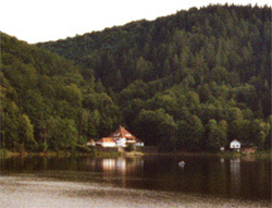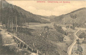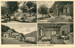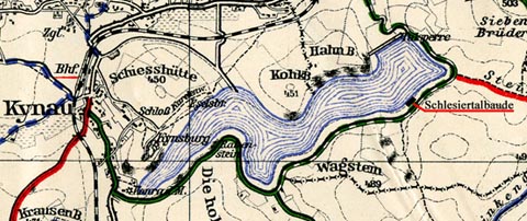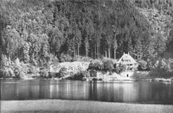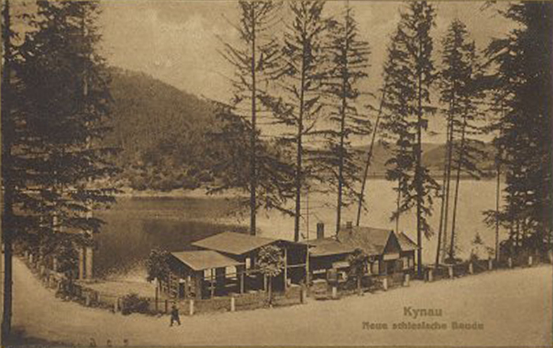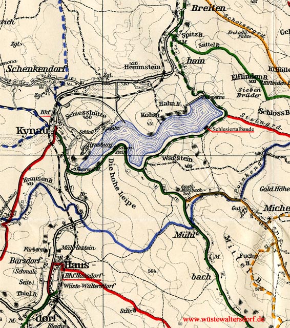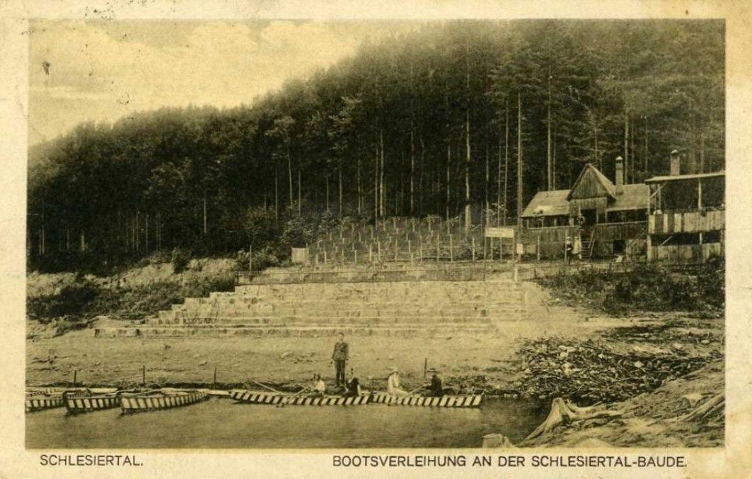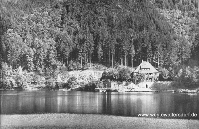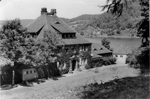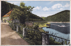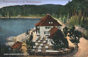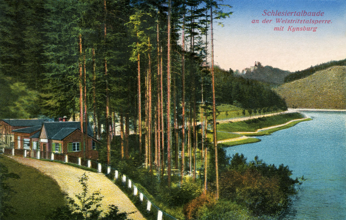 | Schon während den ersten Vorbereitungen für die Talsperre um 1912, Verlegung der Strasse an den Hang (der "Talsperrenweg"), wurde am Talausgang nahe der Sperrbauer eine Baude errichtet, die "Neue schlesische Baude" (sichtbar am Rand links des Fotos). |