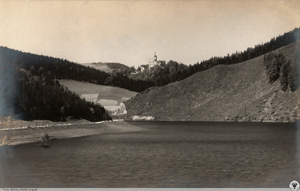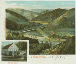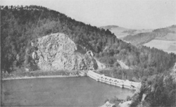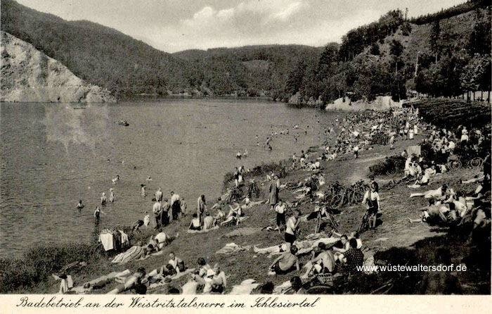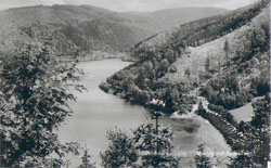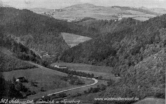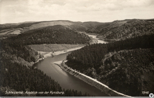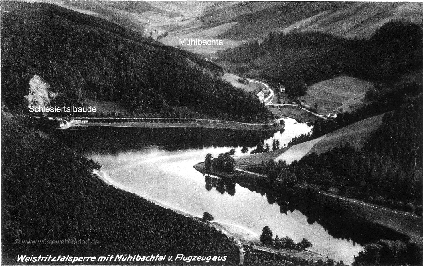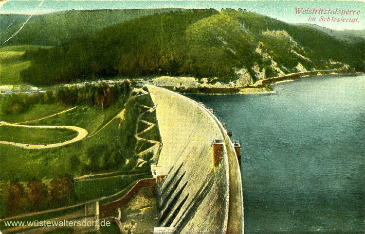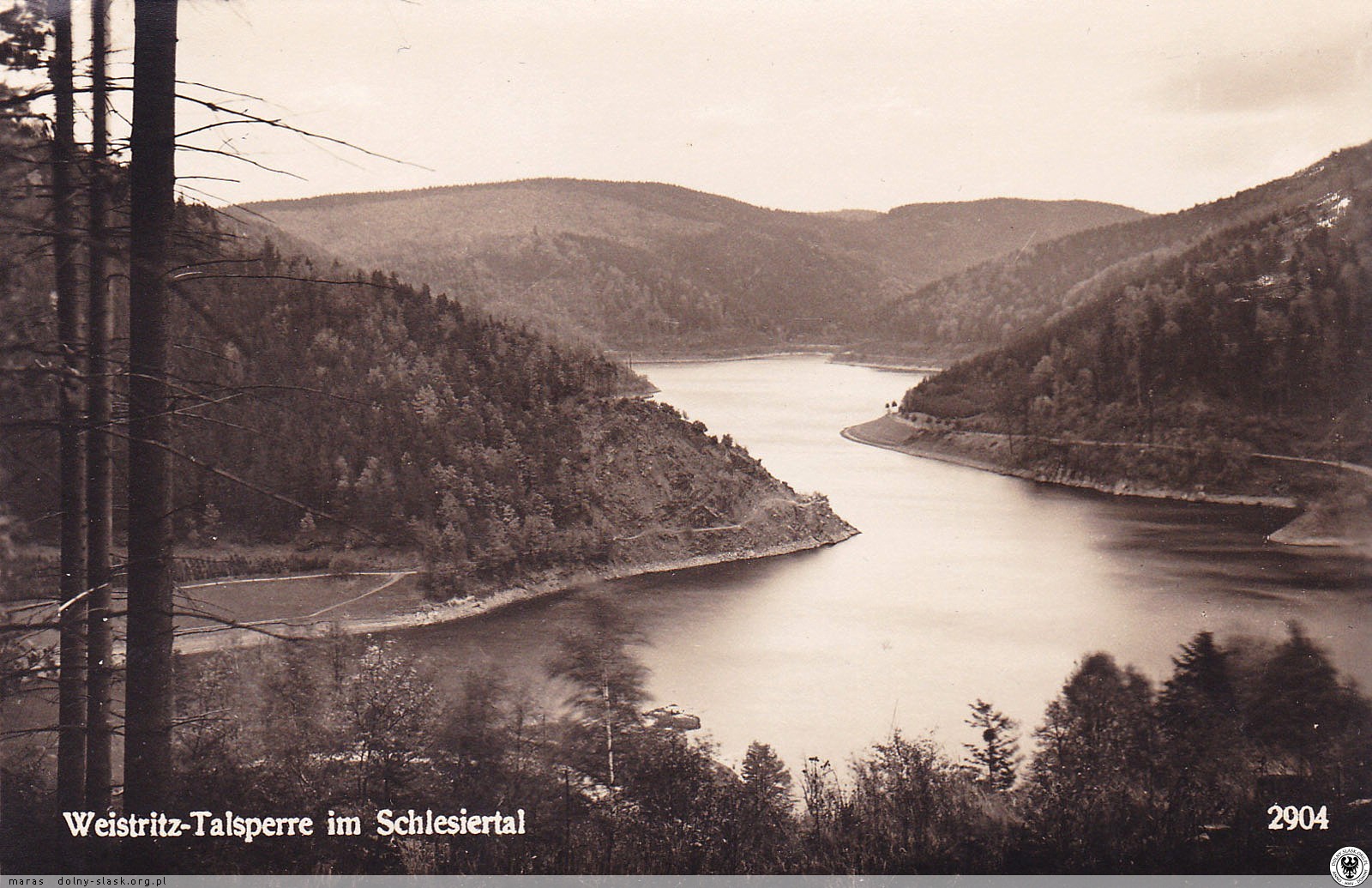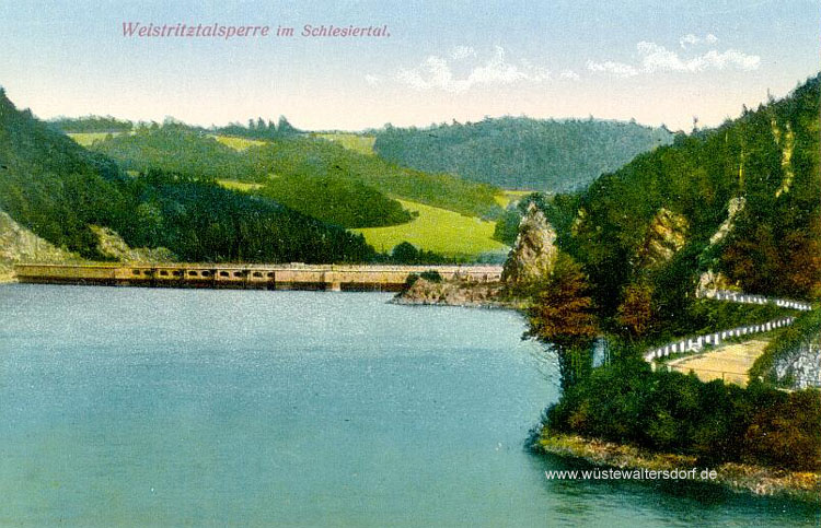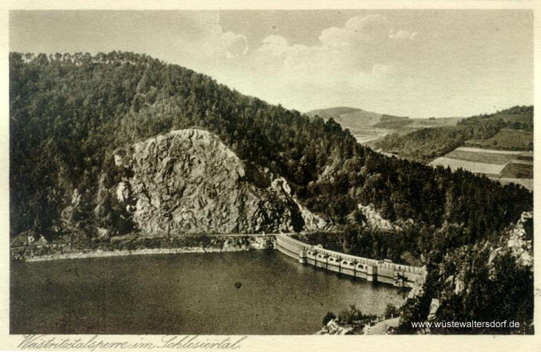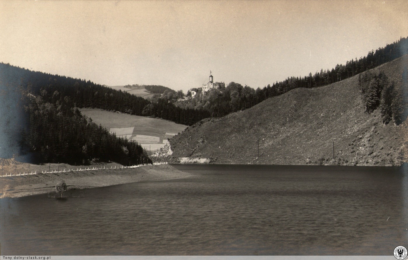 Talsperre, Blick Richtung Kynsburg Für den Bau der Talsperre wurden sämtliche Häuser des Tals von der Provinzial-Verwaltung aufgekauft, darunter auch die Thalmühle, und versanken in den Fluten der Talsperre. Weitere eindrucksvolle Bilder, wie es im Tal vor dem Bau der Talsperre aussah, sind zu finden unter dolny-slask.org.pl.