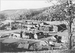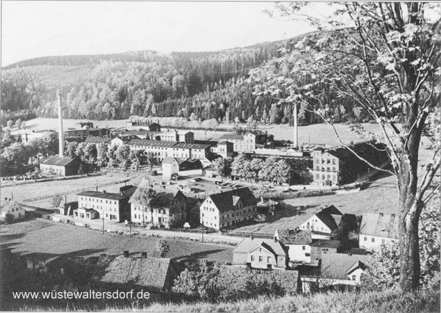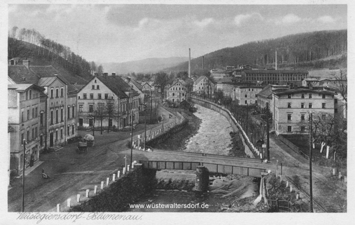 Wüstegiersdorf-Blumenau, Aufnahme von 1923 Ortsteil von Wüstegiersdorf, wuchs durch die Industrialisierung bis 1875 innerhalb von 20 Jahren in der Einwohnerzahl um das Fünffache, von 400 auf 2000 Einwohner. In den Zwanziger Jahren hatte die Meyer-Kauffmann-Textilwerke AG in den beiden großen Betrieben in Wüstegiersdorf und Blumenau allein 1300 mechanische Webstühle installiert. |