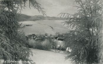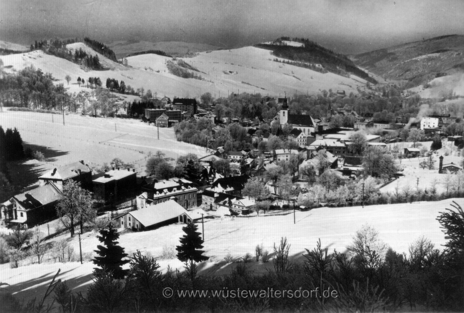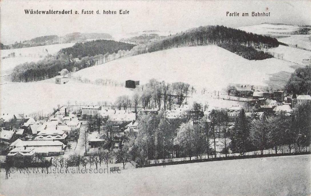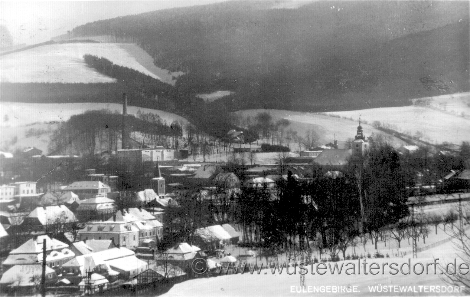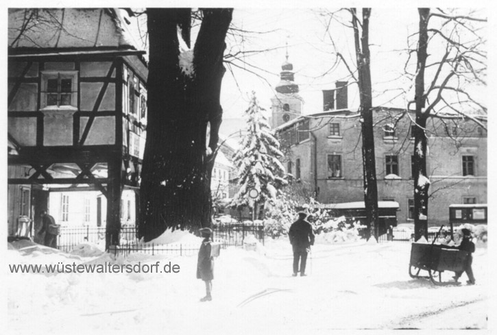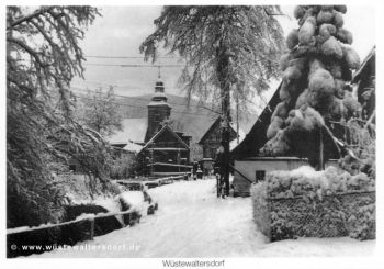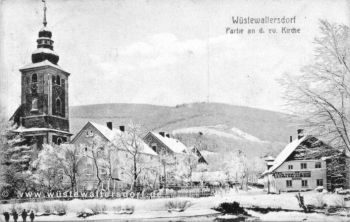 verschneitetes Wüstewaltersdorf, ev. Kirche, Hacketeich (im Vordergrund), Pfarrhaus und "Warenhaus" (1908) | |