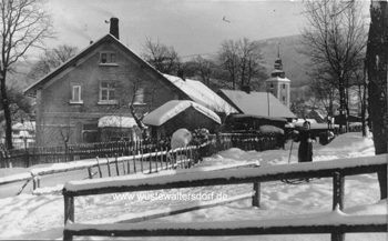 Wüstewaltersdorf im Schnee - links die kath. Kirche, am Strassenende die Knillmannlinde | |