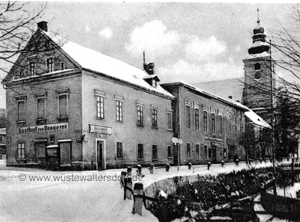 Aufnahme von 1941, Blick von der Neuroder Strasse Richtung katholische Kirche, links Gemüsestand, hinteres Gebäude, 1. Eingang Elektrogeschäft Gustav Güttler, 2. Eingang Gasthaus zur Brauerei, rechts „Preuss. Krone“ |