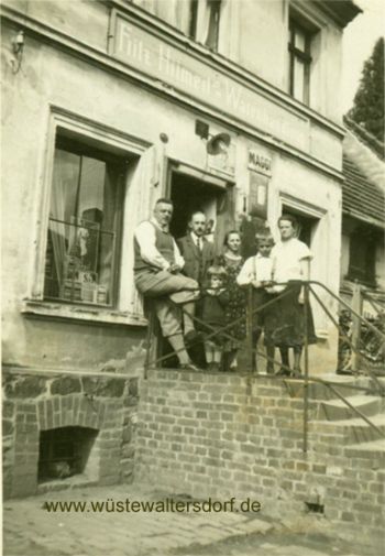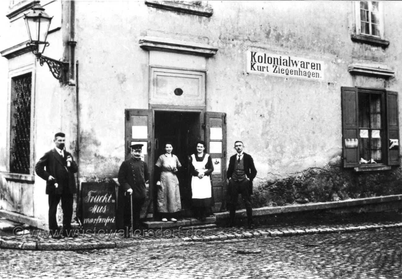 Kolonialwarengeschäft Ziegenhagen (Bahnhofstr. (Hans-Carl-Wiesen-Str.) 1, Ecke Waldenburger Str.) Foto um 1920, zur Verfügung gestellt von H. Neumann Das gebäude gehörte zum Hielscher Hof, 1750 Leinenhändler Haupt, - 1842 Carl Haupt mit einer Öl-Fabrik – 1880 Fa. Hielscher Landwirtschaft. Frau Hielscher gründete 1877 ein Lebensmittelgeschäft. Spätere Inhaber Otto Liepelt und Kurt Ziegenhagen, letzter Gesamtbesitzer war Tischlermeister Kohlmann, der seinen Besitz seinen 3 Kindern vererbte |