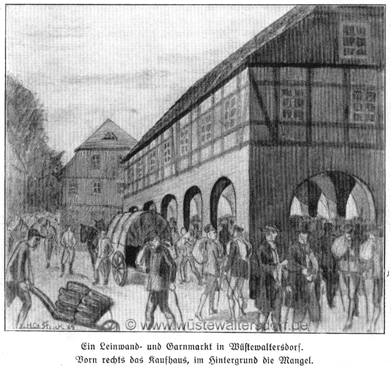 Dr. Richard Gottwald berichtet in seiner Chronik „Das alte Wüstewaltersdorf, ein Beitrag zur Geschichte des Eulengebirges": ,,Der Bau ist für den Handel ein wichtiges Ereignis und hat auch seine Vorgeschichte. Hier stieß nämlich der Dorfadlige des 18. Jahrhunderts auch auf eine städtische Gerechtsame. Der Magistrat von Schweidnitz, dem diese Anlage gegen die Handwerksurbarien-Regulierung im Fürstentum Schweidnitz vom Jahre 1645 und 1694 geschaffen zu sein schien, erhob Einspruch gegen Errichtung dieses neuen Werkes und hatte damit auch zunächst Erfolg. Der Grundherr wandte sich aber an den König mit der Bitte, ihm die Konzession gegen Erlegung von 150 Rtl. zu erteilen. Bei Untersuchung der Sachlage stellte sich heraus, daß Wüstewaltersdorf nicht unter dem Meilenrecht der Stadt Schweidnitz lag. Und da Friedrich der. Große die Bedeutung der Mangel für den Leinwandhandel erkannte, erteilte er am 14. März 1757 die in Dresden eigenhändig unterschriebene Konzession." Die Leinwandkaufleute kamen immer mehr und mehr zu Wohlstand und Ansehen, und der blühende Handel trug die Kultur des Dorfes. 1779 wurde vom Dominium das Lein wandkaufhaus erbaut, worin die Leinwandkaufleute und Garnhändler sich ihre Stände mieteten. 1782 lieferte die Mangel 16.000 Schock Leinewand, 1783 sogar 20.100 Schock, ja die Kaufleute mußten viel Leinwand ins Glätzische oder nach Hausdorf zur Mangel schicken, so daß sie die Absicht hatten, eine zweite Mangel im Orte zu errichten. 1806 wurde sie gebaut und mit einem Hänge- und Stärkehaus vereinigt."