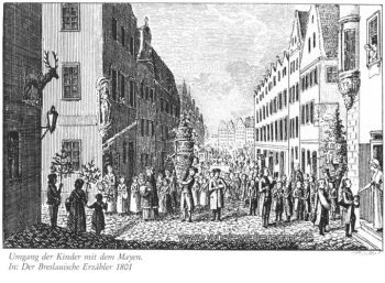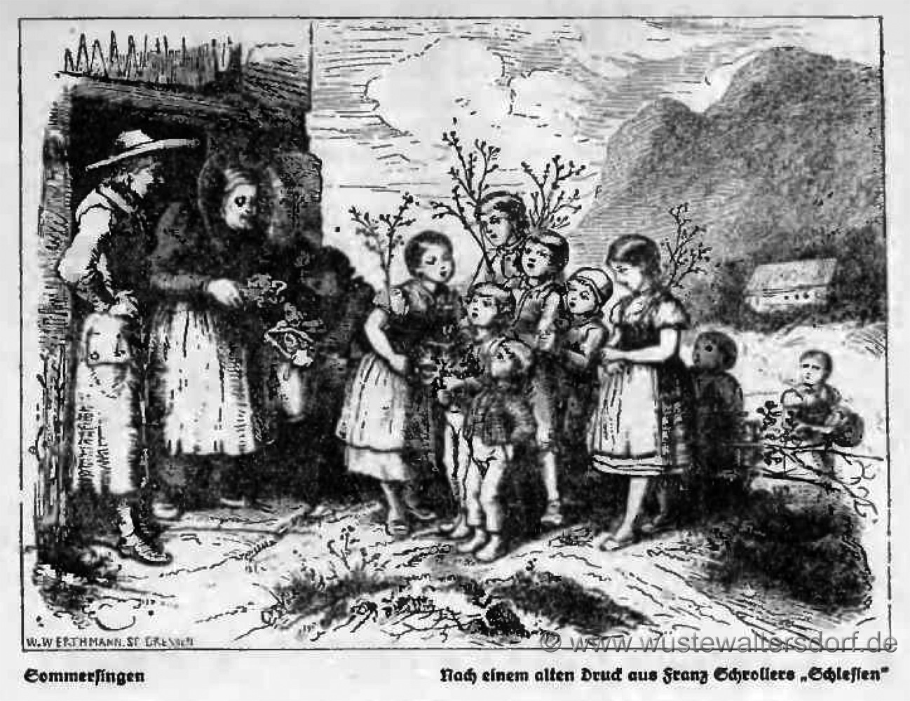 Einer der schönsten Bräuche in Schlesien, besonders von den Kindern geliebt und gefeiert, war das Sommersingen, in der Mundart "Summer" genannt: ursprünglich ein symbolhafter Vorgang, den wir im Westen Deutschlands in der Form des Wettstreits zwischen Sommer und Winter vorfinden. Ich erinnere an die Sonntagszüge mit Butzenpaaren aus Tannenreisig und Stroh, wie wir einen auch in Heidelberg kennen. Mit bunten Bändchen, Fähnchen und Papierrosen soll der Winter vertrieben werden.In Schlesien blieb mit den Jahren nur die positive Seite übrig: das Bringen des Sommers. Früh schon zogen die Kinder am Sonntag Latäre mit ihren bunten Sonntagsstecken, denen der hiesiegen Gegend ähnlich, nur ohne Brezel und Ei, in Rudeln von Haus zu Haus oder von Stockwerk zu Stockwerk, um mit ihren Liedern und Versen um eine Gabe zu bitten.