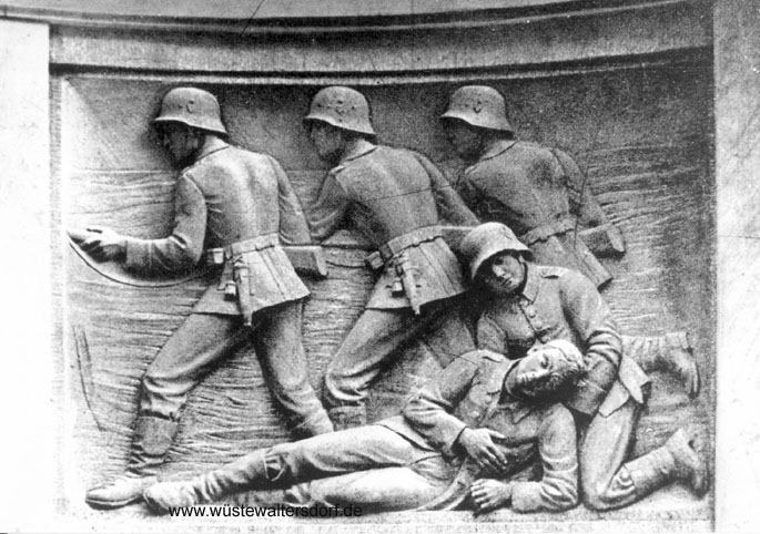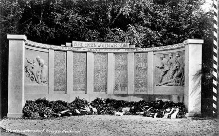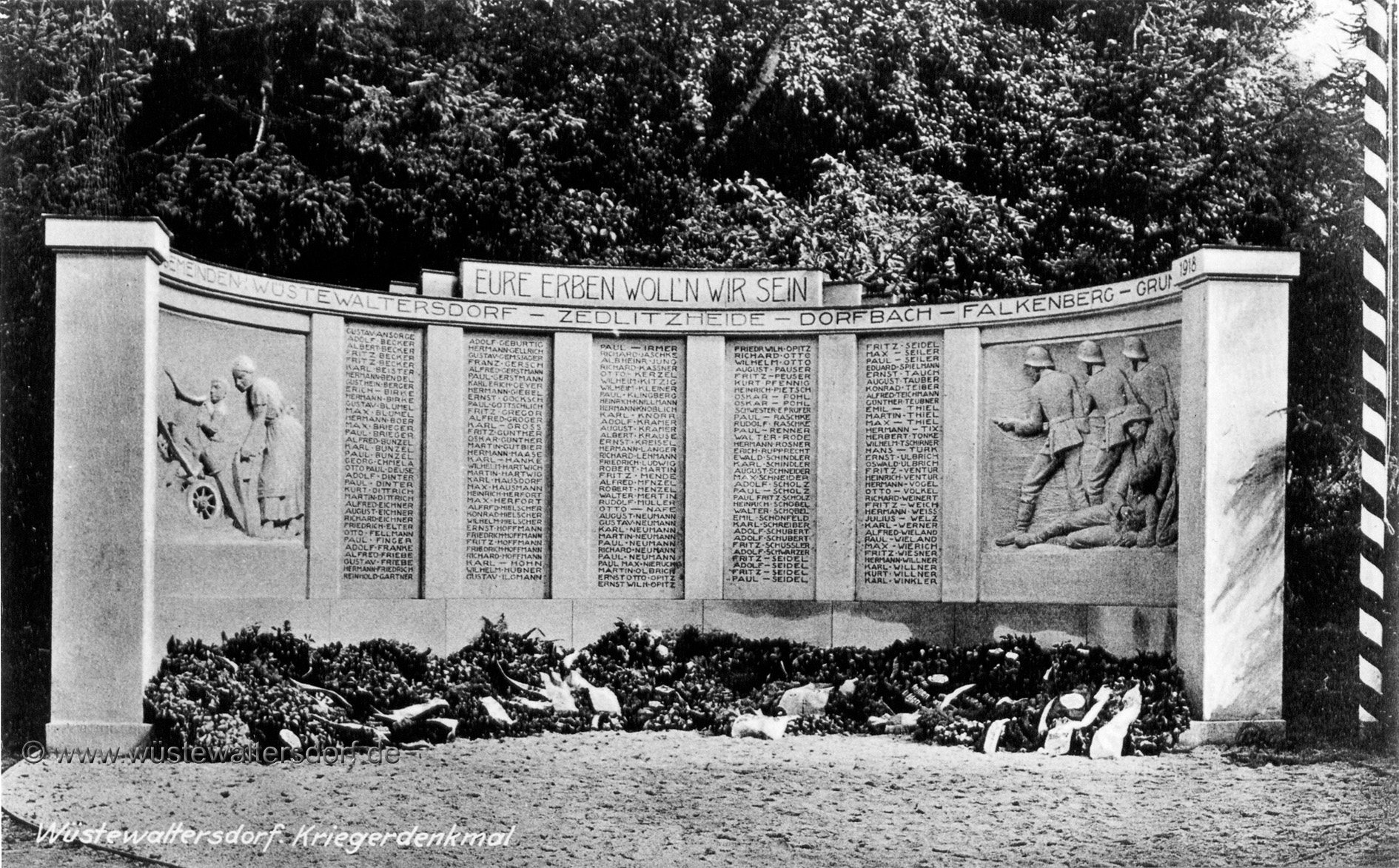 Anfang 1933 begannen Planungen zur Errichtung eines Denkmals für die Gefallenen des 1. Weltkrieges für die Gemeinden Wüstewaltersdorf, Zedlitzheide, Dorfbach und Grund. Standort sollte auf einem Grundstück in der Reichenbacher Strasse, gegenüber dem Postgebäude sein. Die Kosten des Denkmals beliefen sich auf 4500 RM (ohne Fundament und Grundmauern), ein grosser Teil (3700 RM) kam durch Sammlungen und Spenden zusammen.