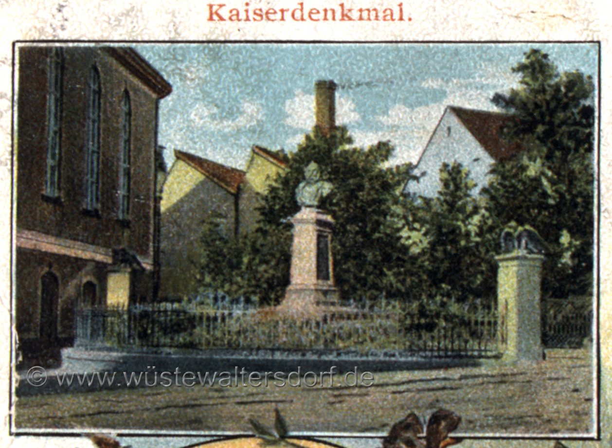 Wie in so vielen deutschen Städten üblich, stand auch in Wüstewaltersdorf ein Kaiser-Wilhelm-Denkmal. Es war rechts neben der ev. Kirche in einem umzäunten Areal (siehe Foto links).