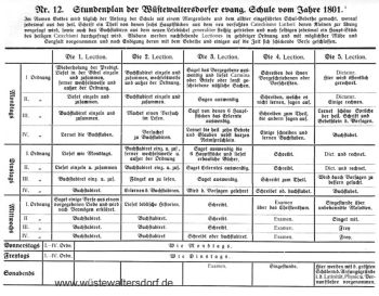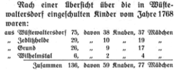 1763 führte Friedrich d. Gr. das "General-Schul-Reglement" ein, das die Schulpflicht für Kinder zwischen 5 Jahren und der Konfirmation (in der Regel 14 im Alter von Jahren) festlegte. Die Durchsetzung war jedoch nicht immer einfach, Not und Armut zwangen die Familien oft, die Kinder arbeiten zu lassen. Ausserdem war es für ärmere Familien nicht einfach, das Schulgeld aufzubringen. Jungen und Mädchen wurden gleichermassen eingeschult, wie eine Liste der eiingeschulten Kinder in Wüstewaltersdorf von 1768 zeigt.