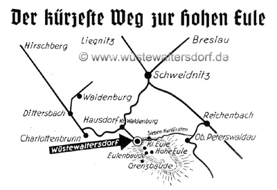 Günstige Bahnverbindungen auf der direkten Bahnlinie Breslau - Schweidnitz - Hausdorf und von da ab mit der Bergbahn nach Wüstewaltersdorf ermöglichen eine schnelle und bequeme Zufahrt zum Gebirge. Alljährlich ist der Strom der Erholungssuchenden und Wanderlustigen, die es nach der Hohen Eule zieht, in ständigem Wachstum begriffen.