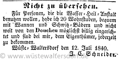 Im Sommer 1840 umfaßte diese Anstalt laut einer Anzeige der in Waldenburg erscheinenden „Schlesischen Gebirgs-Blüthen" 20 Wohnstuben für Kurgäste, bequem liegende Wannen und Schwitzbäder und nicht weit davon mehrere „Douchen". Ausführlicheres über das Schneidersche Kaltwasserbad erfahren wir aus einer Anzeige in demselben Blatt vom 22. März 1841.
