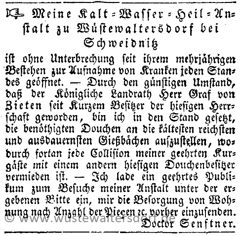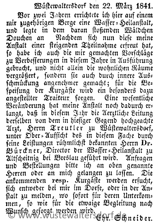 "Wem ist es wohl noch bekannt, daß Wüstewaltersdorf nach dem Niedergang seines einst so blühenden Leinenhandels auf dem Weg war, Kurort zu werden? Dr. Richard Gottwald läßt sich in seinem ortsgeschichtlichen „Das alte Wüstewaltersdorf" nur ganz kurz darüber aus, und doch scheint es angebracht, sich dieser Bemühungen, wieder Suche erhöhtes wirtschaftliches Leben in den Ort zu bringen, zu erinnern, zumal sie gerade 100 Jahre zurückliegen. Ohne Zweifel hätte sich das landschaftlich reizvoll liegende Dorf mit seinen stilgerechten Bauten für einen Kurort ausgezeichnet geeignet. Das hatte wohl der Kaufmann Christian Schneider aus Wüstewaltersdorf erkannt, der anscheinend ein Anhänger des damals aufkommenden Prießnitzschen Wasserheilverfahrens war. Er errichtete 1839 in seinem Bauerngut Nr. 93 eine Kaltwasserheilanstalt und übergab sie der Leitung des Dr. Senftner aus Breslau.