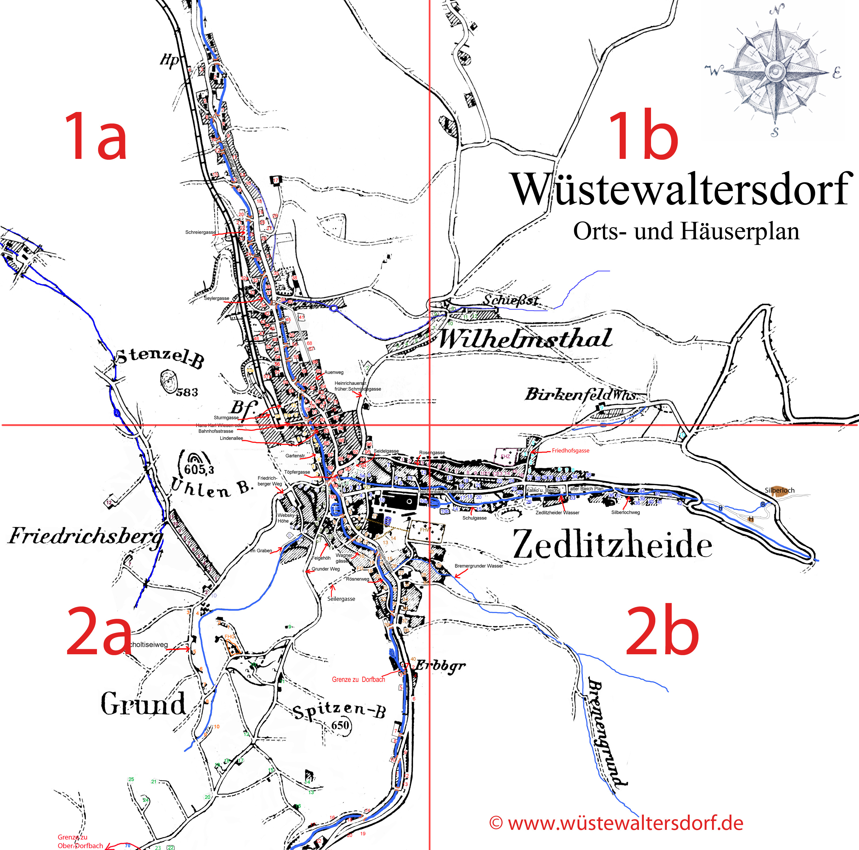 Ortspläne von Wüstewaltersdorf und Ortsteilen, erstellt nach einer Auflistung und Skizzen des Wüstewaltersdorfers Gerhard Tschirner, sowie für Dorbach und Falkenberg nach Günter Proll,