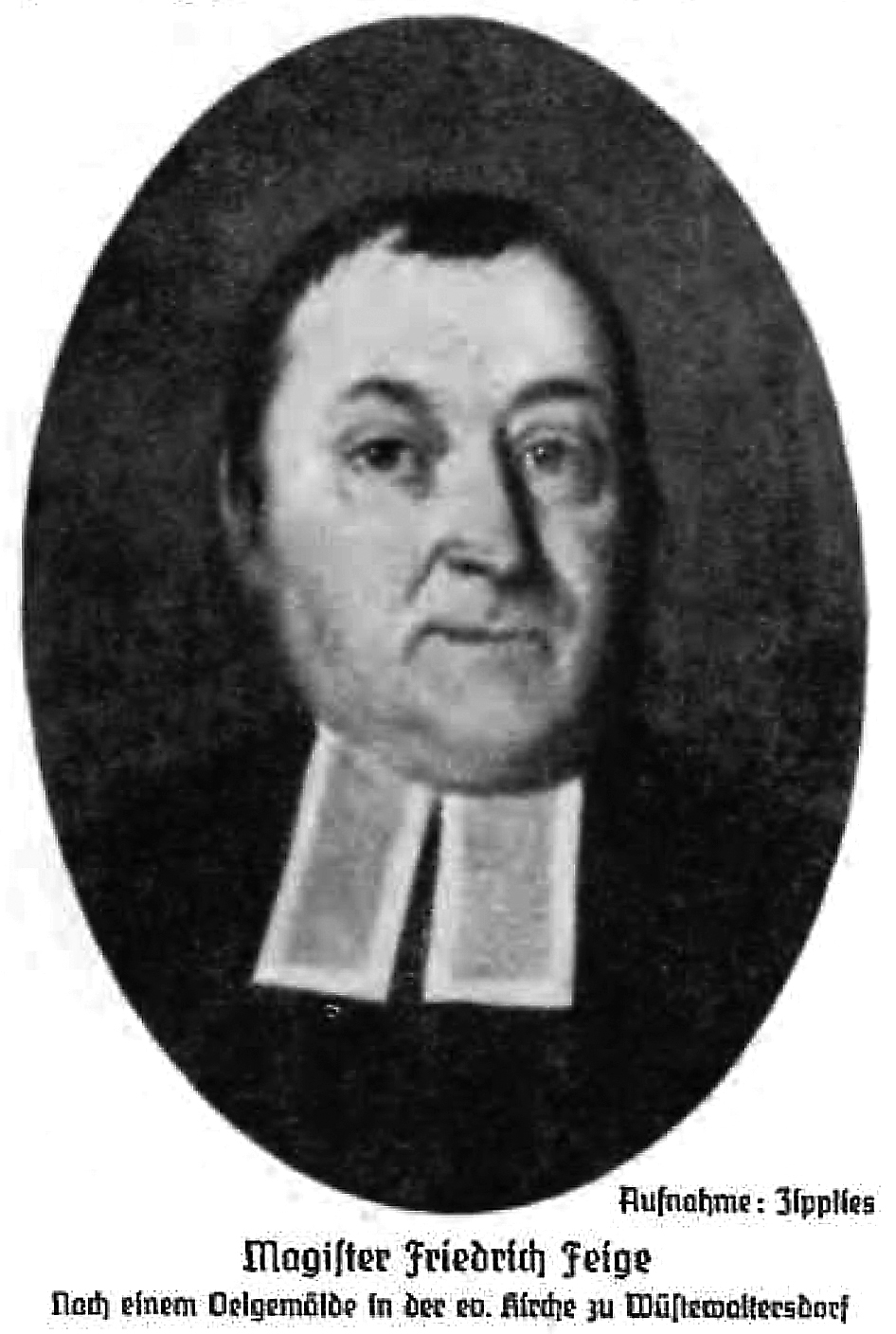 Magister Feige wurde 1763 als Pastor nach Wüstewaltersdorf und am 27.2.1763 in sein Amt eingeführt. Neben seiner Tätigkeit als Pastor baute er das Schulwesen im Auftrage der Grundherrschaft auf.