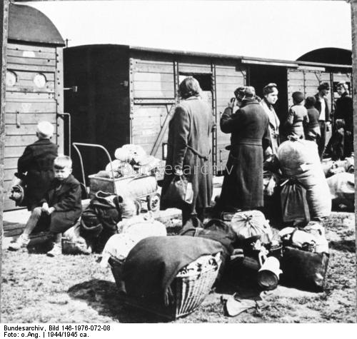 Zuvor mußten wir noch unser Silbergeld abgeben, wir bekamen zwar eine Bescheinigung über den Betrag, der sollte uns in der englischen Besatzungzone in Deutschland ausgezahlt werden; es war natürlich eine Lüge. Die Behandlung durch die Kontrolleure war so widerwärtig, alles was gefiel wurde einfach weggenommen. Als wir den letzten Koffer öffnen sollten, wo Gegenstände verpackt waren, die uns sehr am Herzen lagen, bot meine Mutter der Kontrolleurin das Bündel Zloty-Scheine an. Erst zögerte sie, meine Mutter gab ihr noch ihre Armbanduhr, die ihr wohl gefiel und sie ließ uns dann sehr unwirsch passieren. Mit unserem letzten Hab und Gut gingen wir zu dem Gleis hinter der Schule, wo ein Güterzug zum Abtransport bereitstand. 36 Personen waren in unserem Viehwaggon. (...). In der Nacht hielt der Zug auf offener Strecke. Die Männer verriegelten die Schiebetür, nachts wurden sogar Züge geplündert. Hinter einer Decke war ein Eimer unsere Toilette, den Zug durfte niemand verlassen.